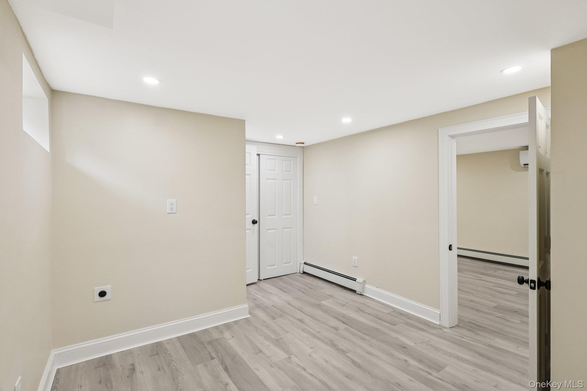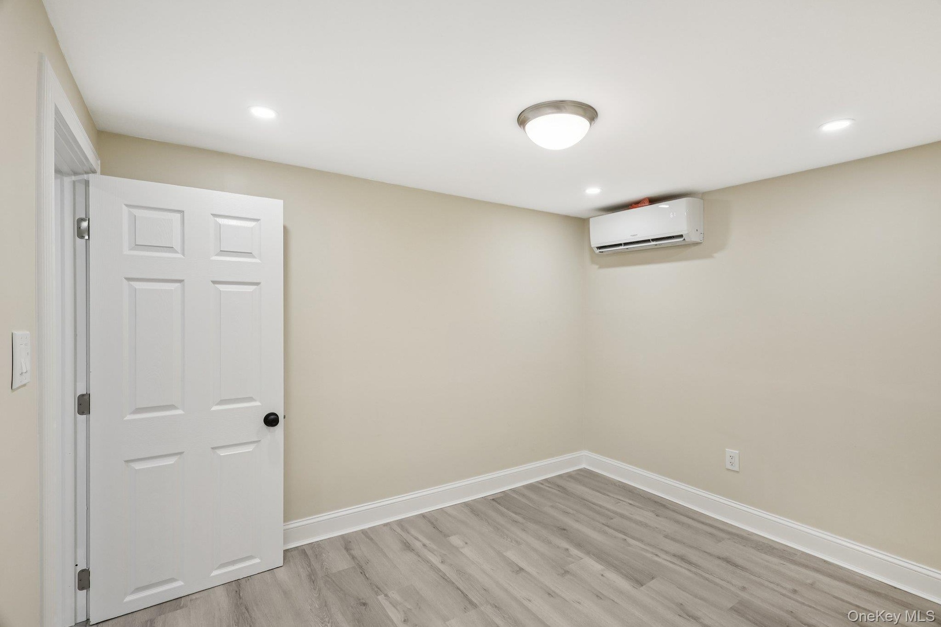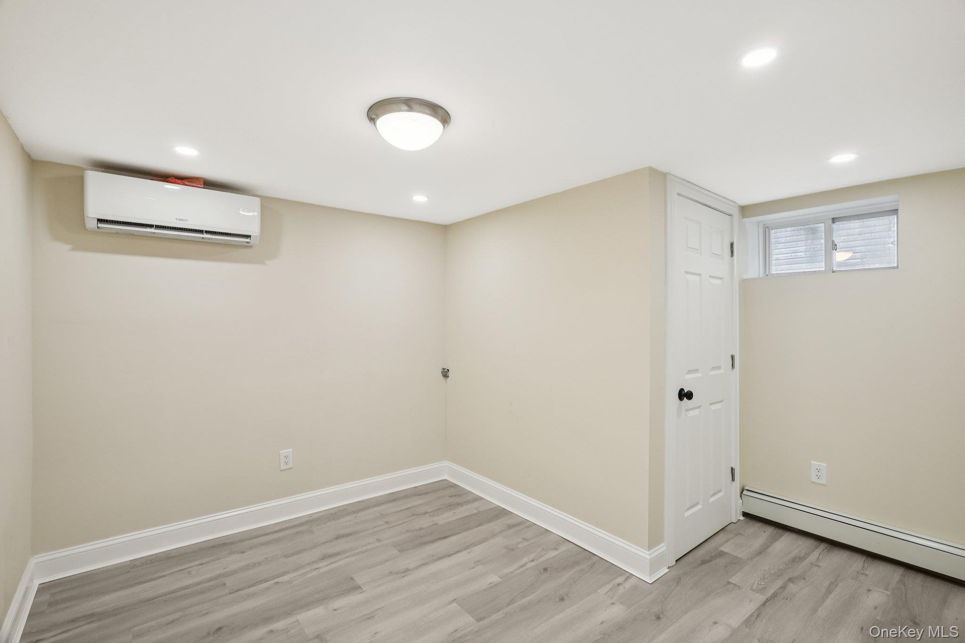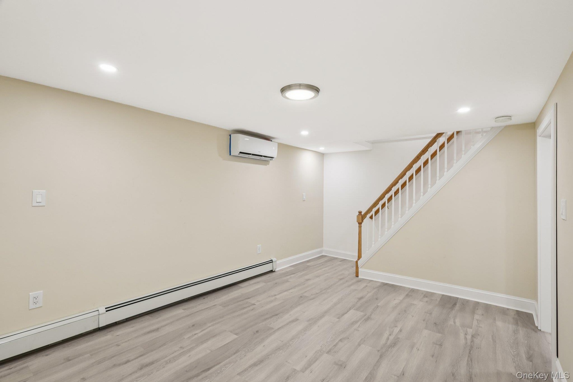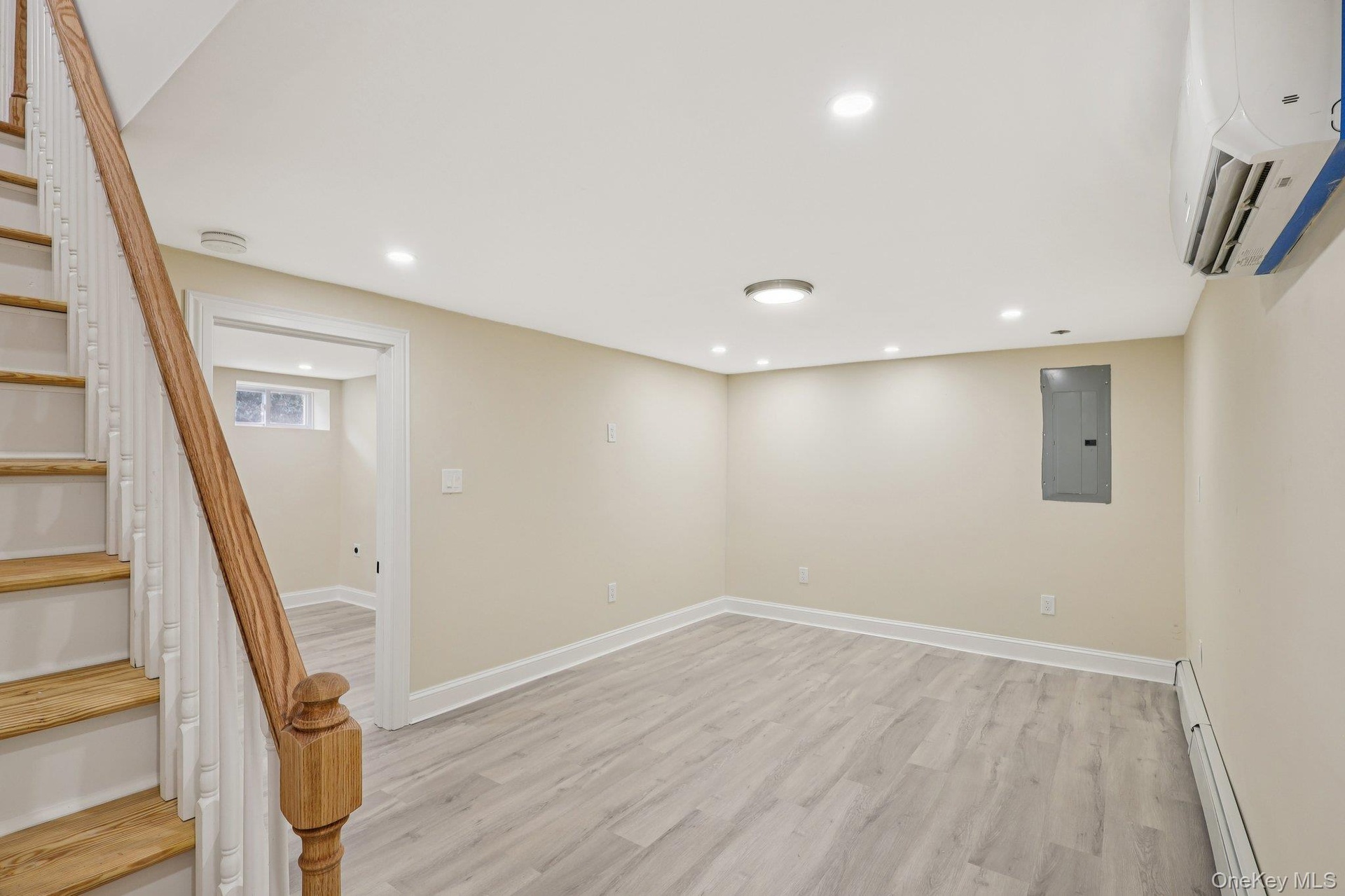 - Finished below grade area with light wood-type flooring, recessed lighting, and a wall unit AC