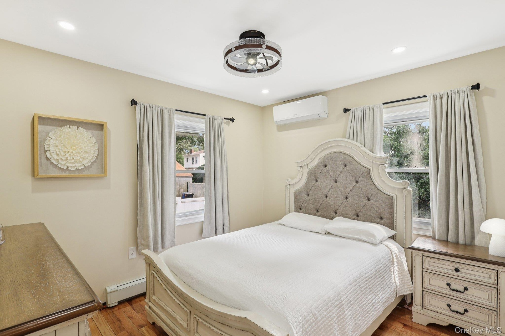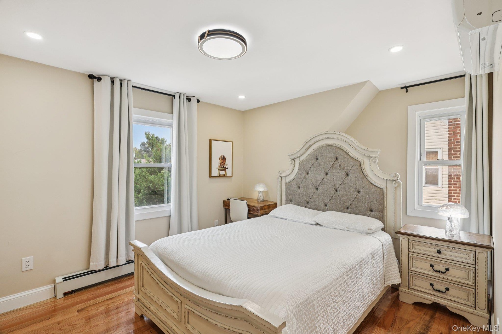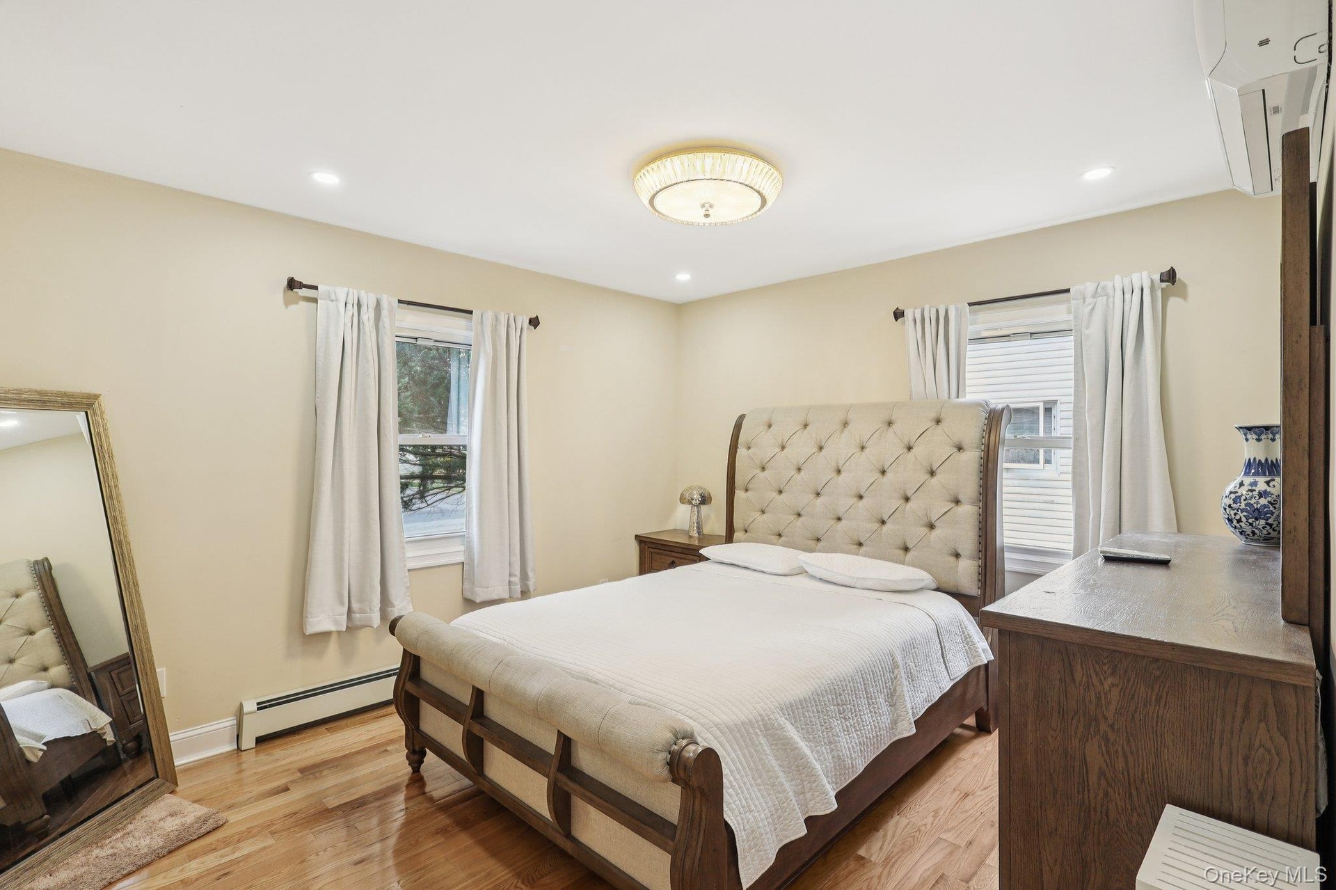 - Bedroom featuring multiple windows, baseboard heating, light wood-style flooring, and recessed lighting
