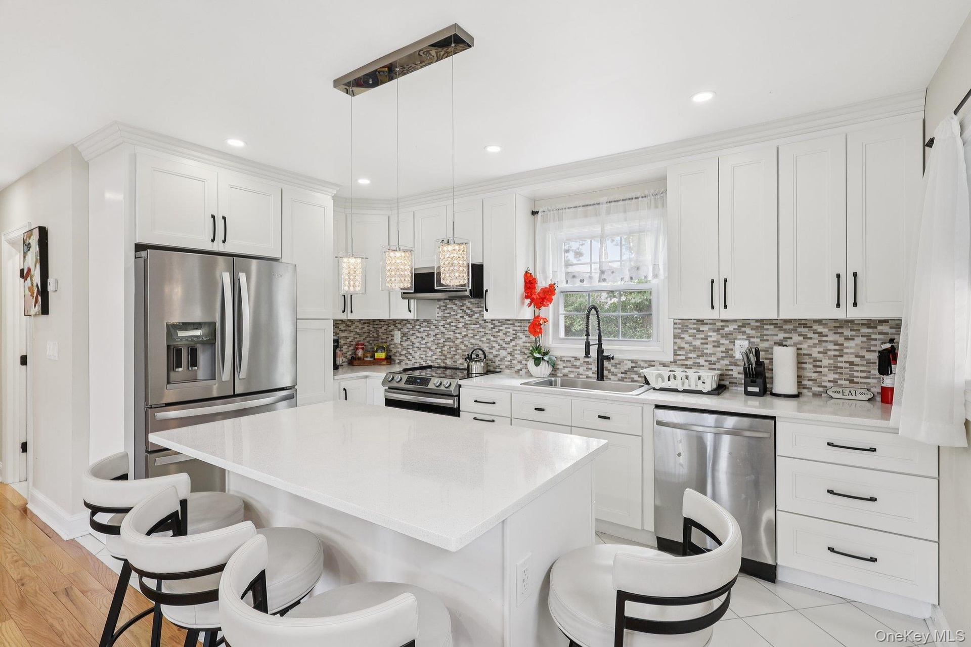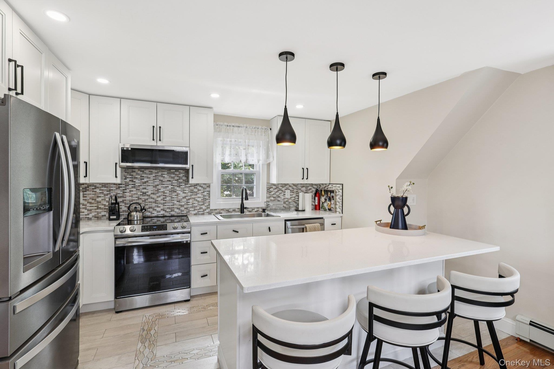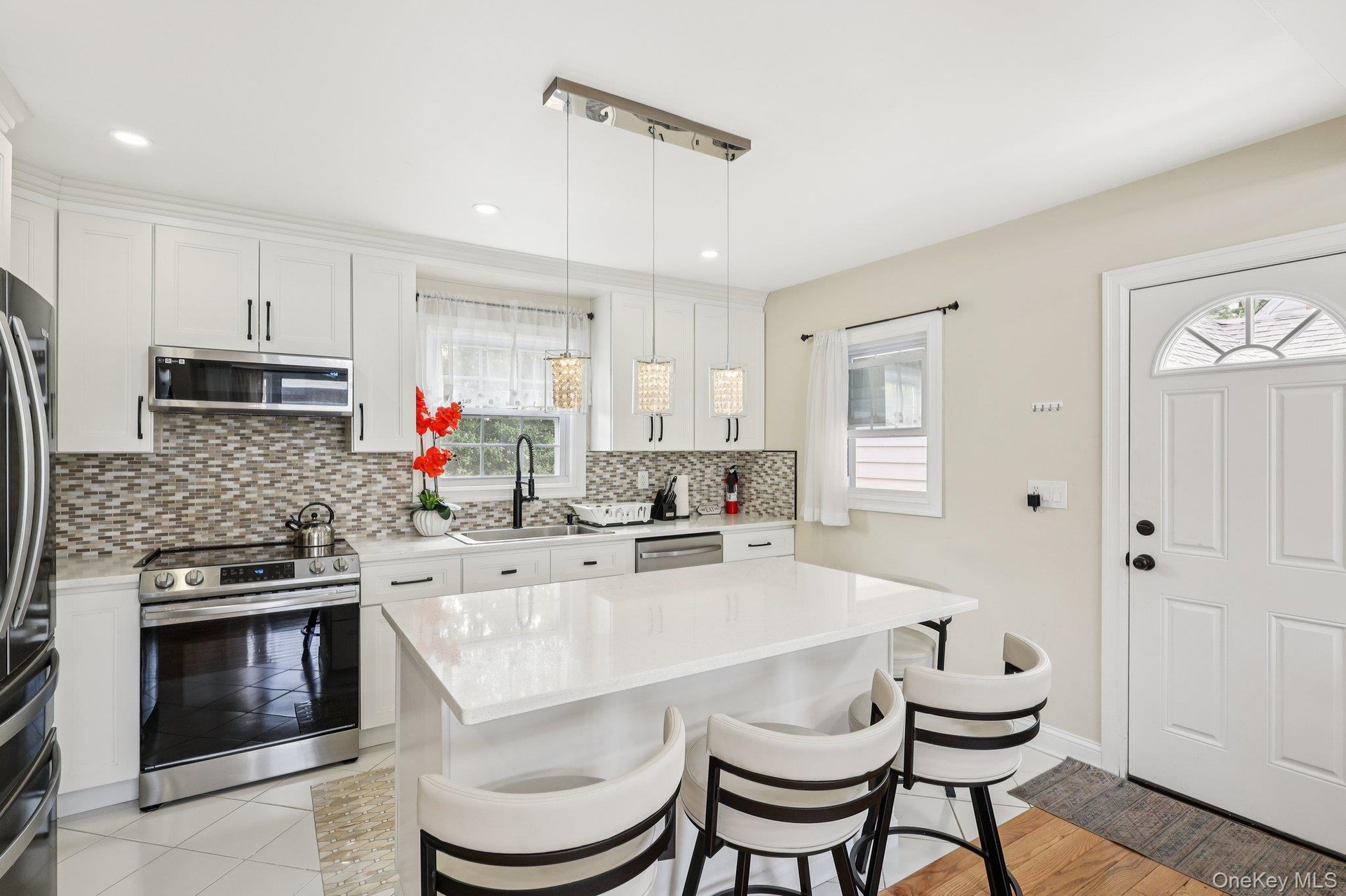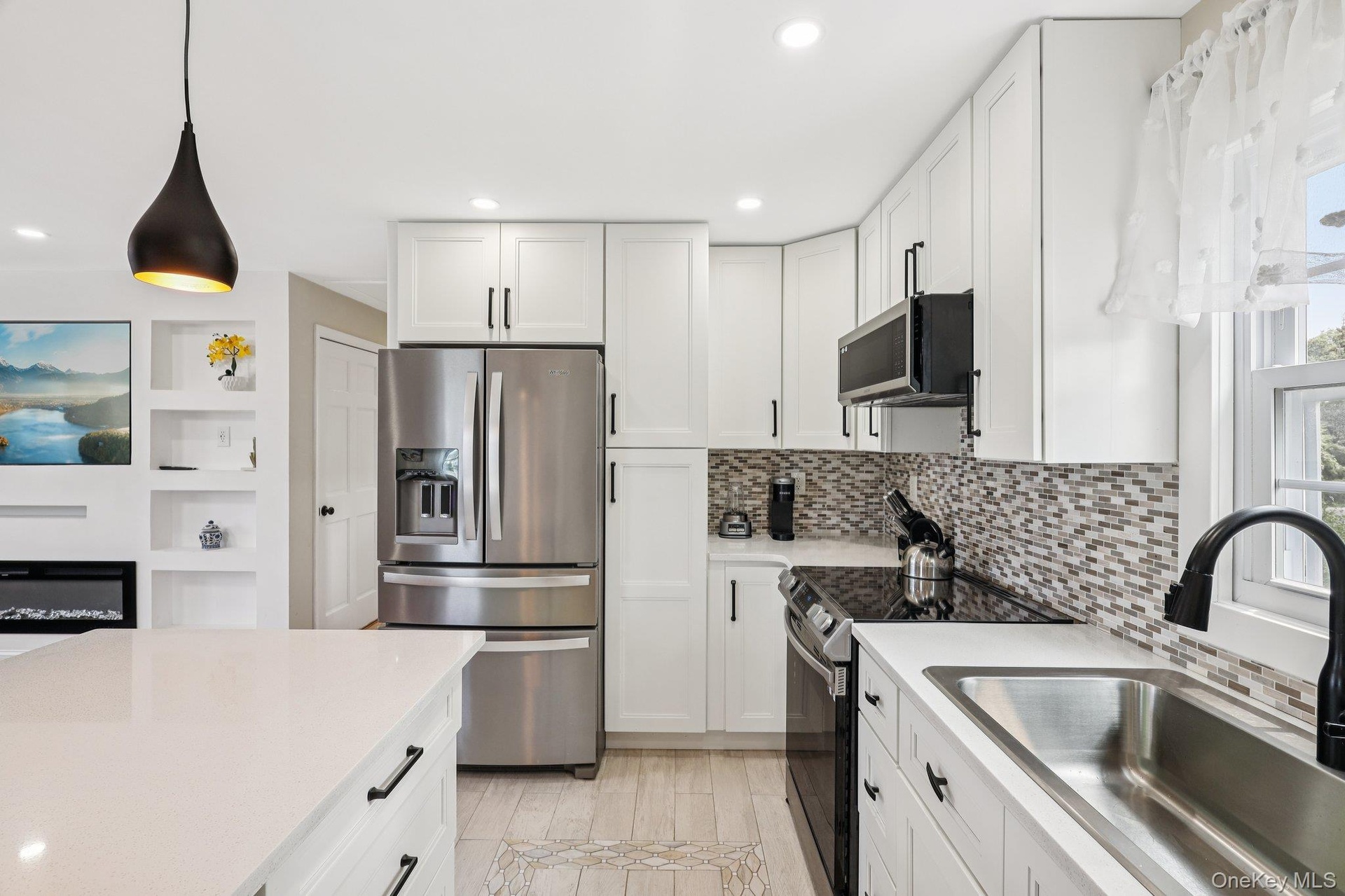 - Kitchen with stainless steel appliances, light tile patterned flooring, tasteful backsplash, recessed lighting, and white cabinetry