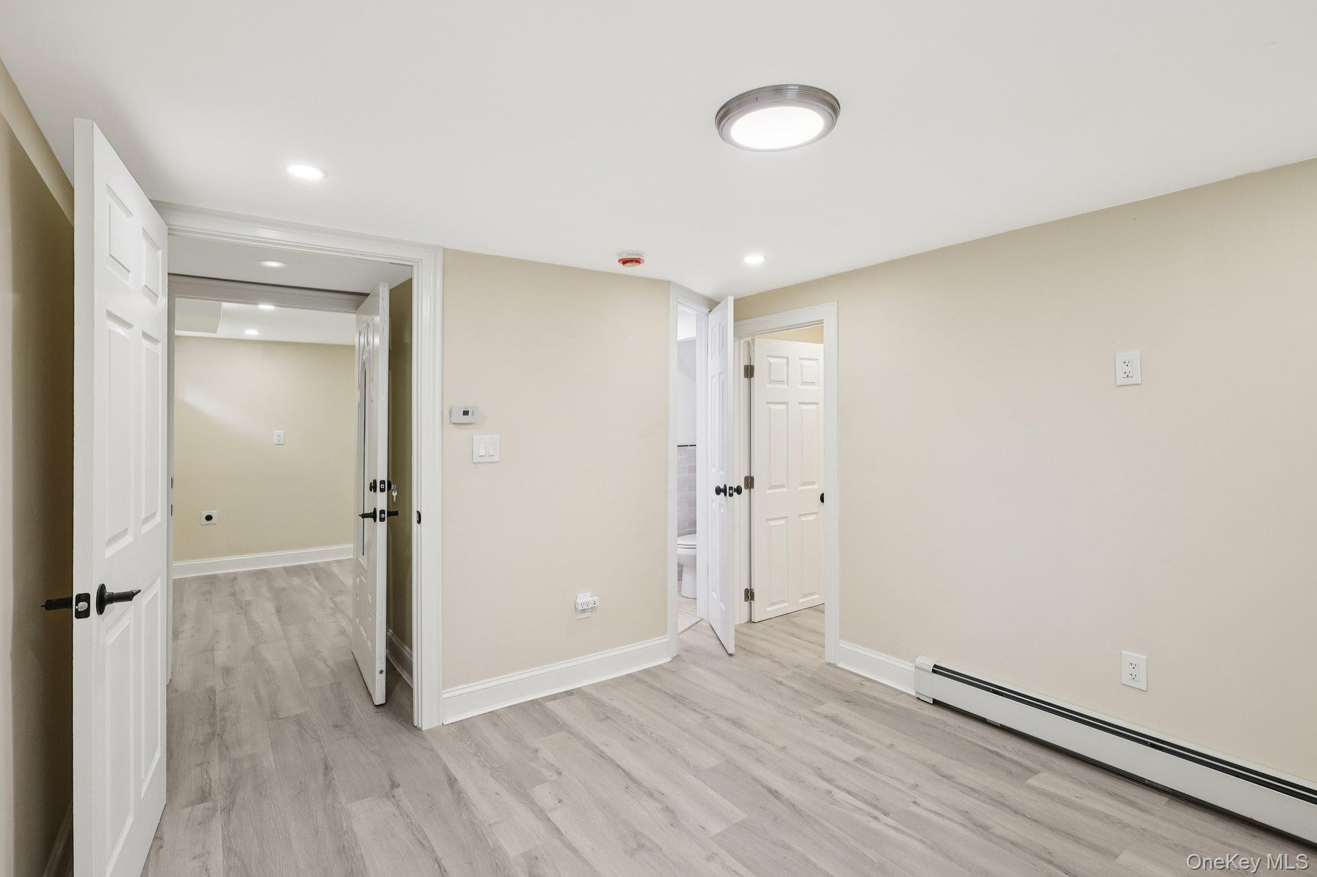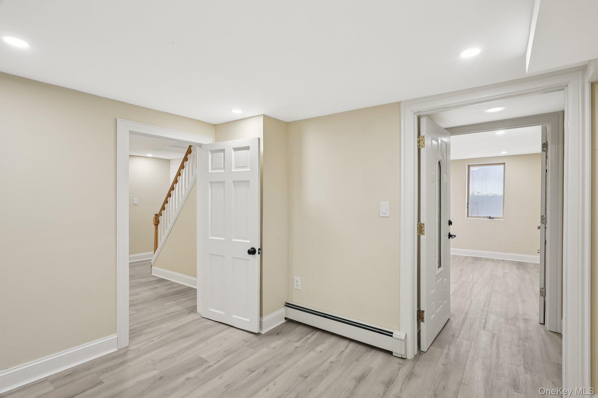 - Below grade area featuring a baseboard heating unit, light wood finished floors, and recessed lighting