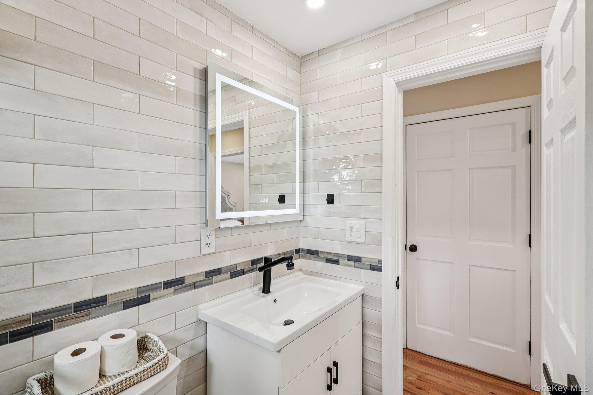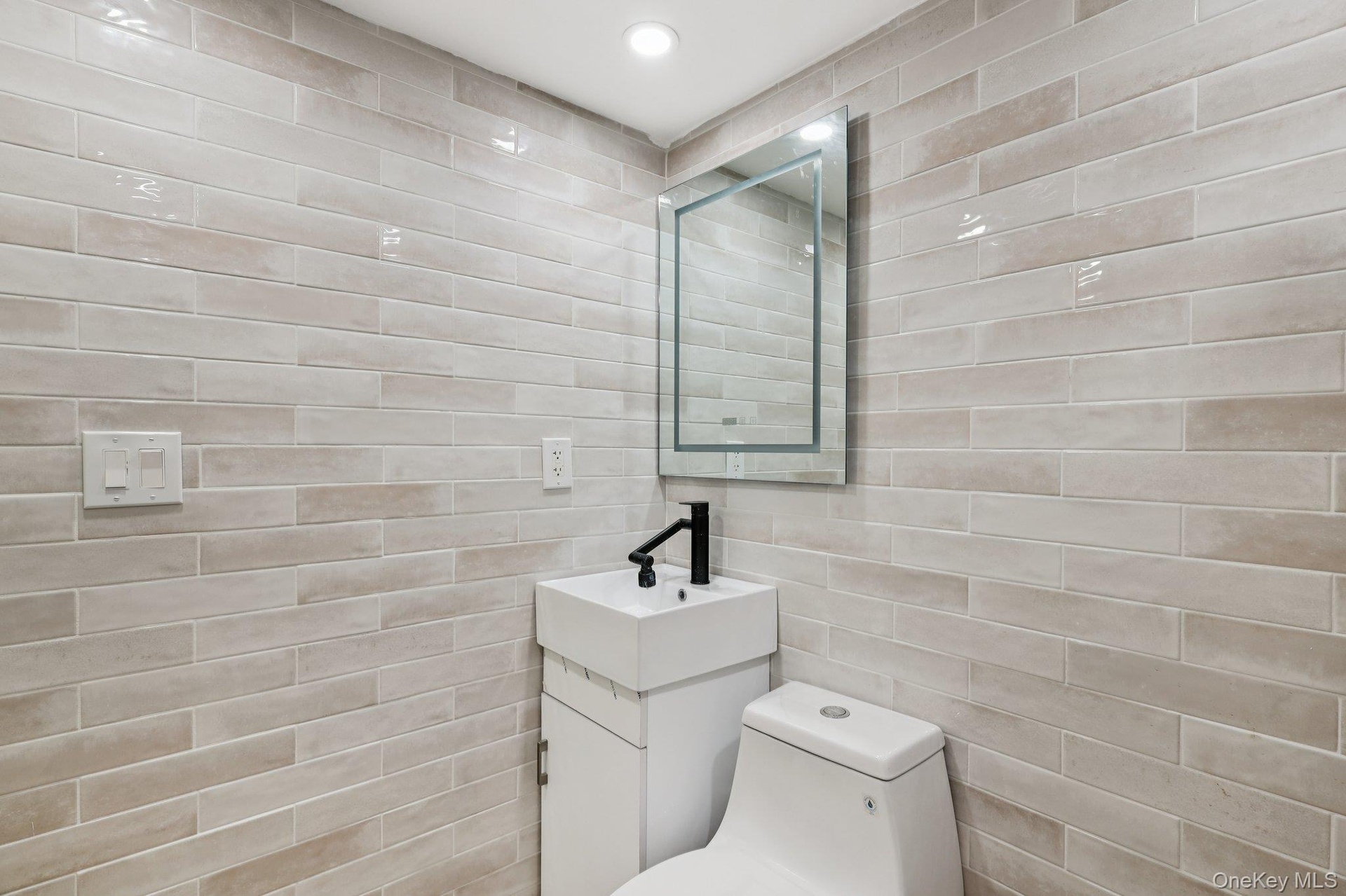 - Bathroom with tile walls and vanity