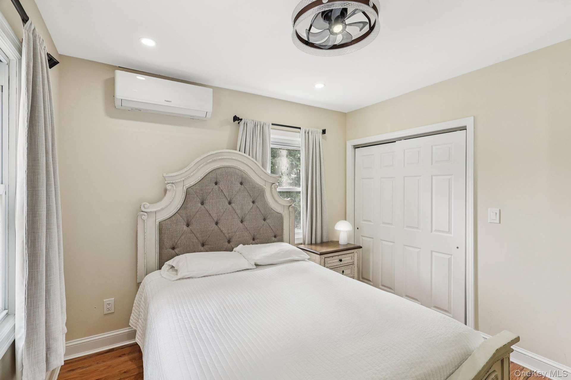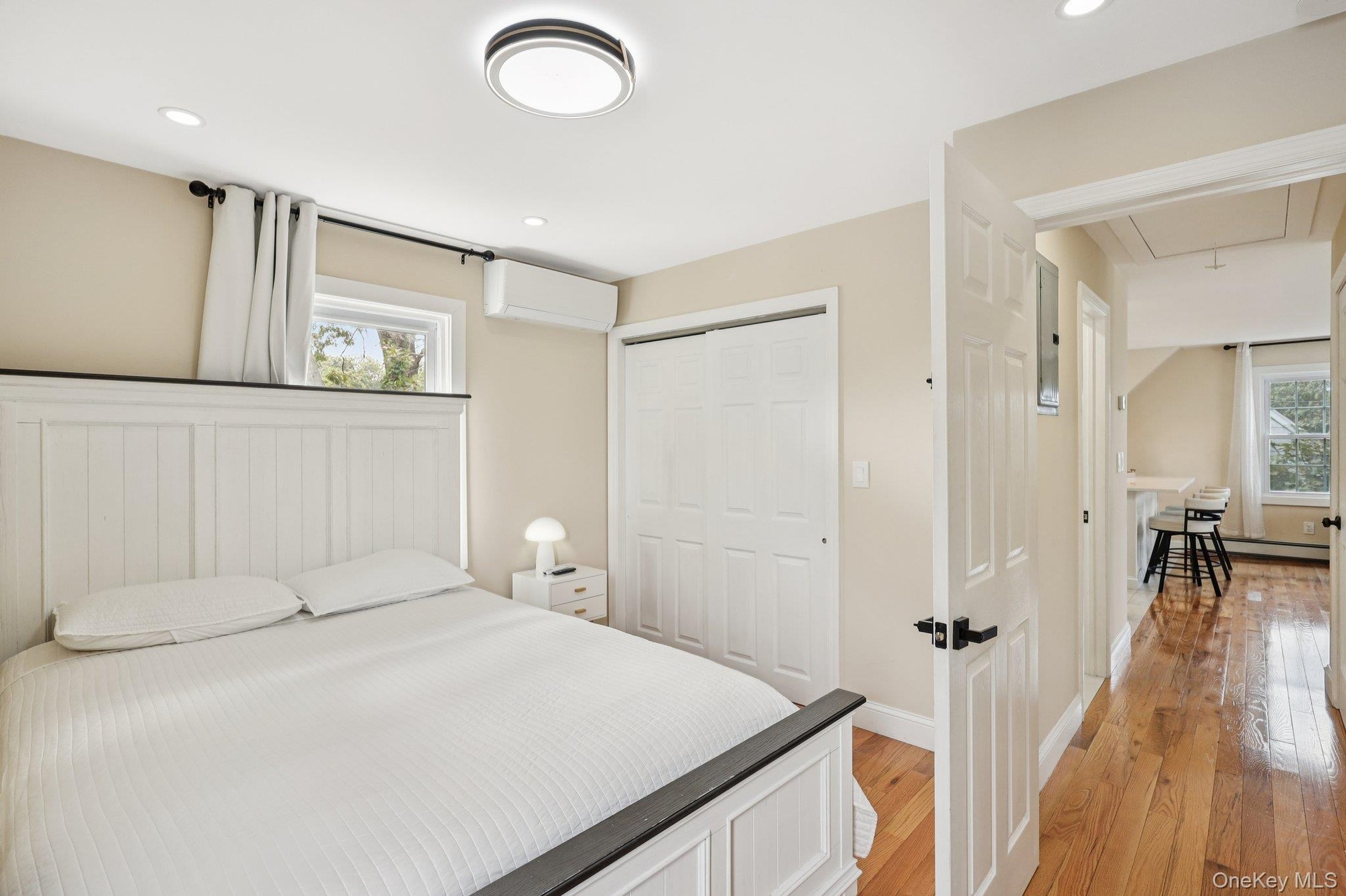- Bedroom with wood finished floors, a wall mounted air conditioner, a closet, and recessed lighting
