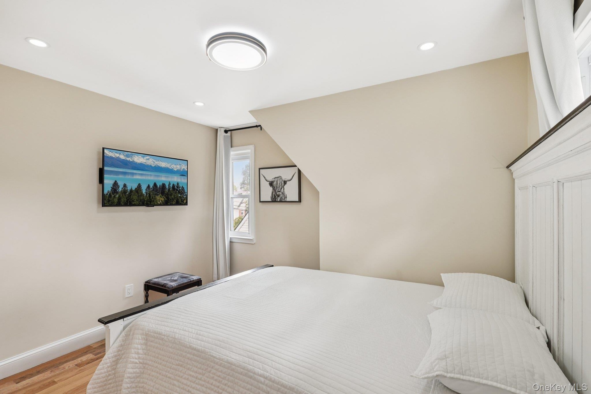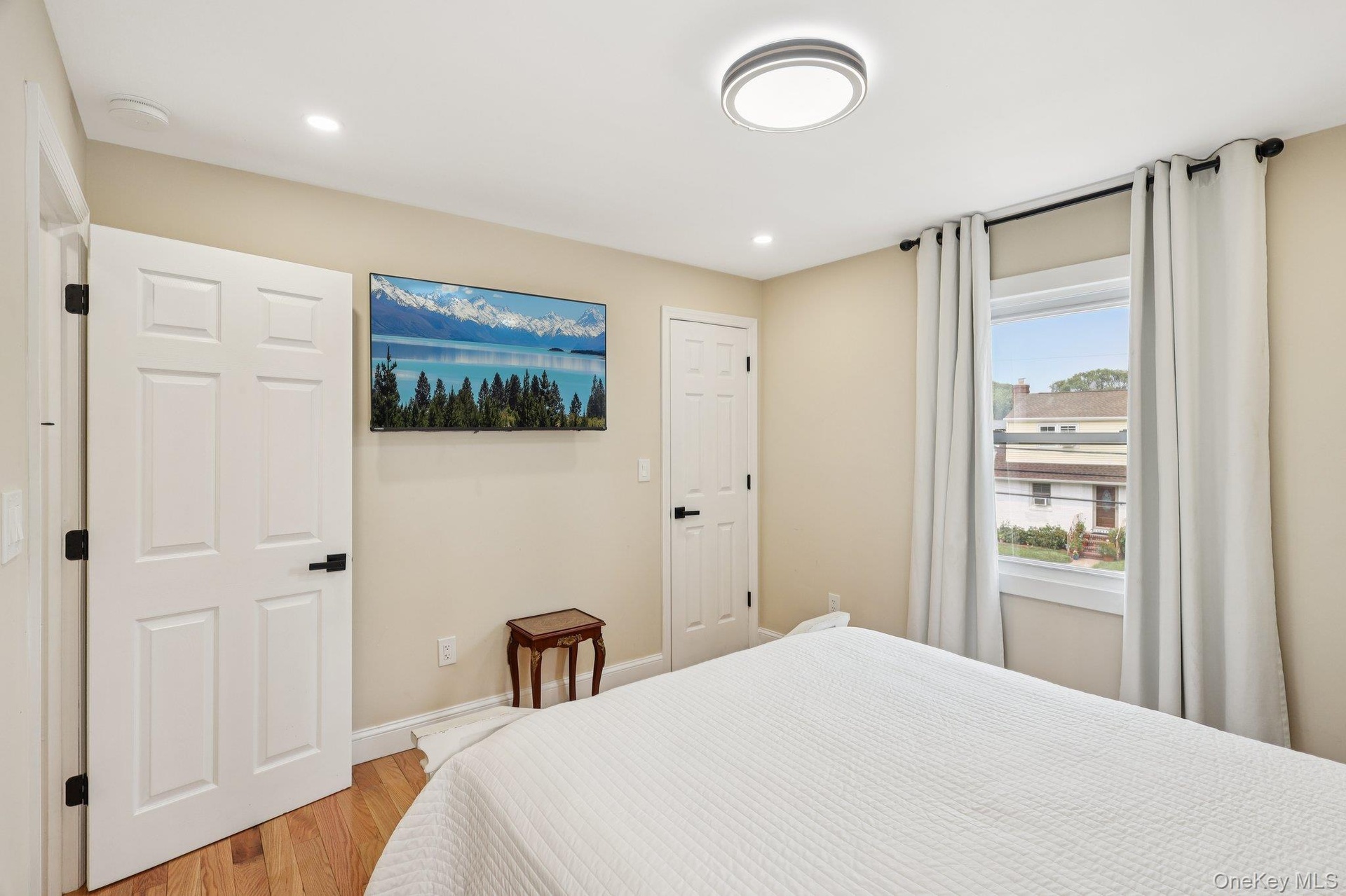 - Bedroom with light wood finished floors and recessed lighting