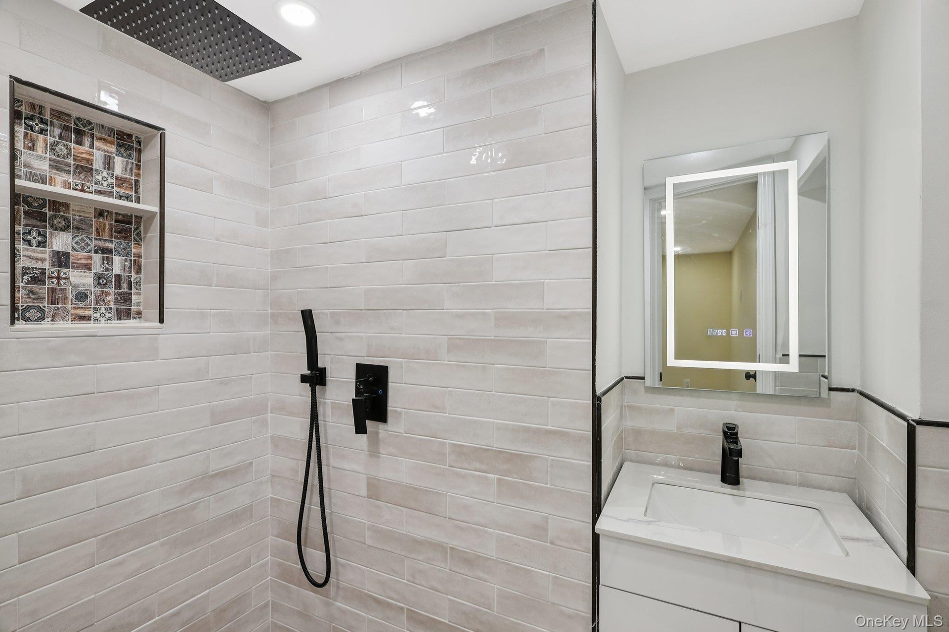 - Bathroom with a tile shower, tile walls, vanity, and recessed lighting