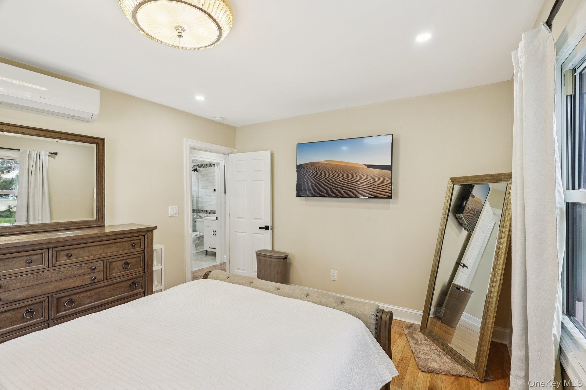 - Bedroom featuring an AC wall unit, light wood-style floors, and recessed lighting