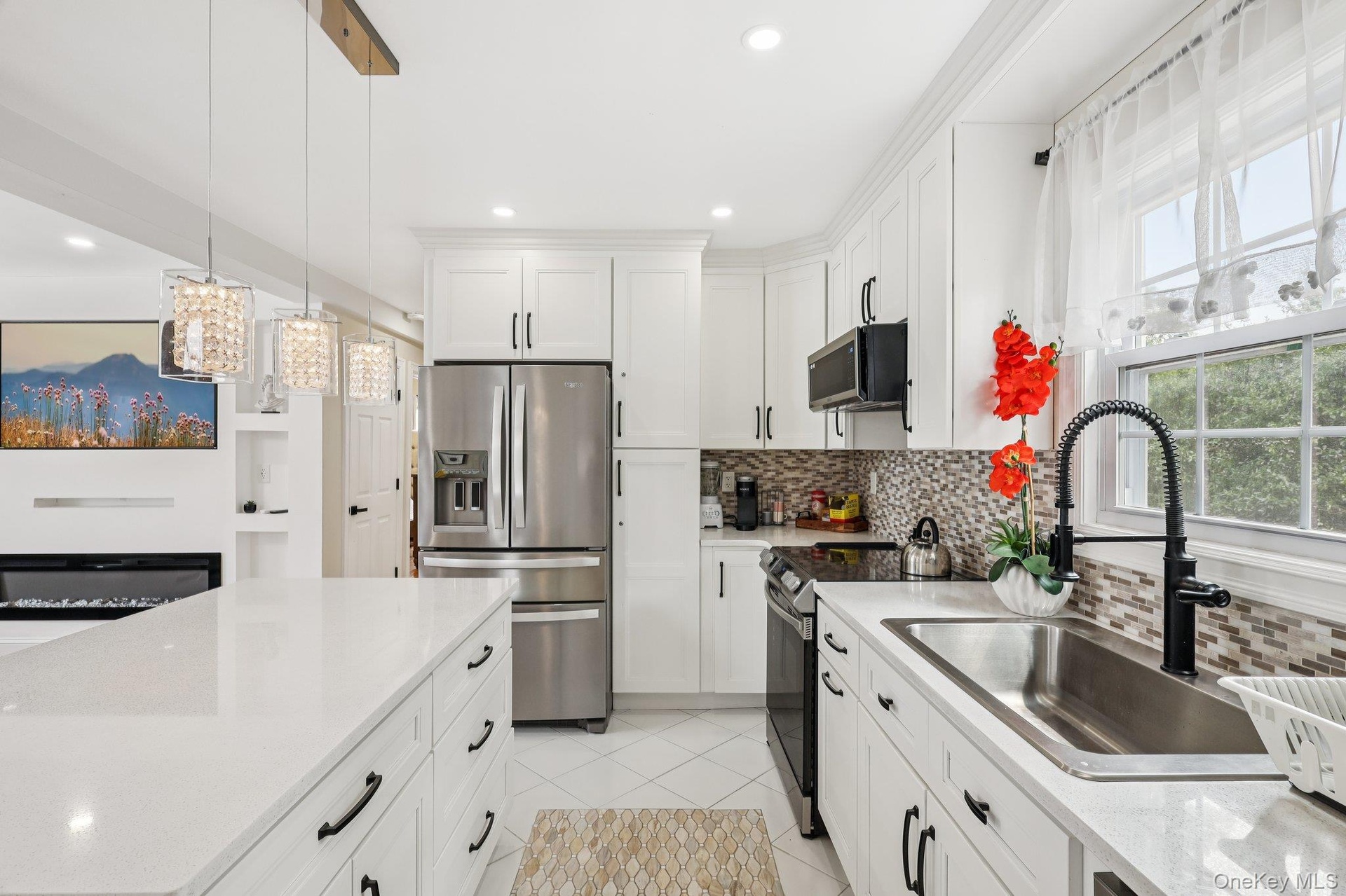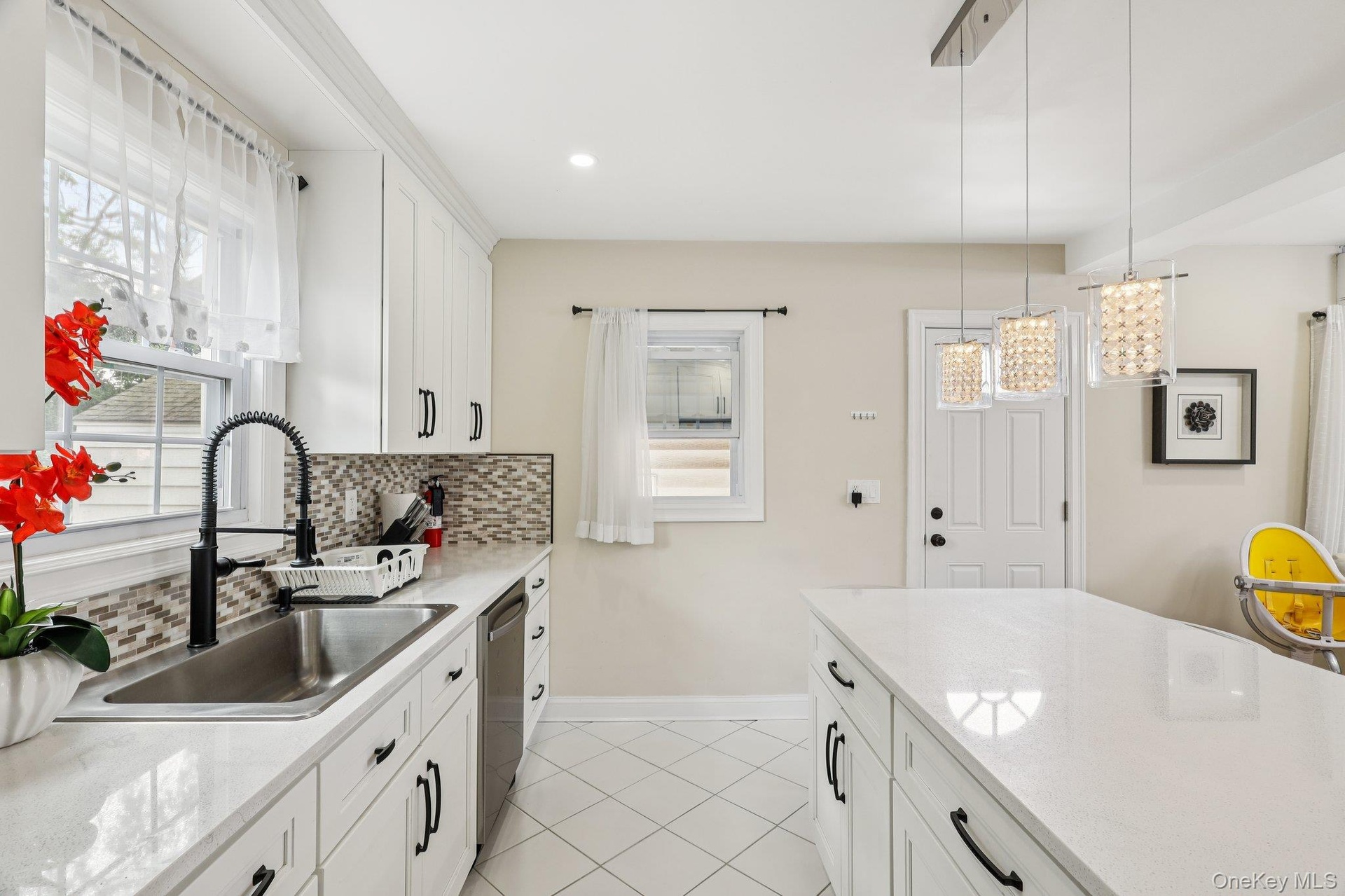 - Kitchen with tasteful backsplash, white cabinets, recessed lighting, light tile patterned flooring, and hanging light fixtures