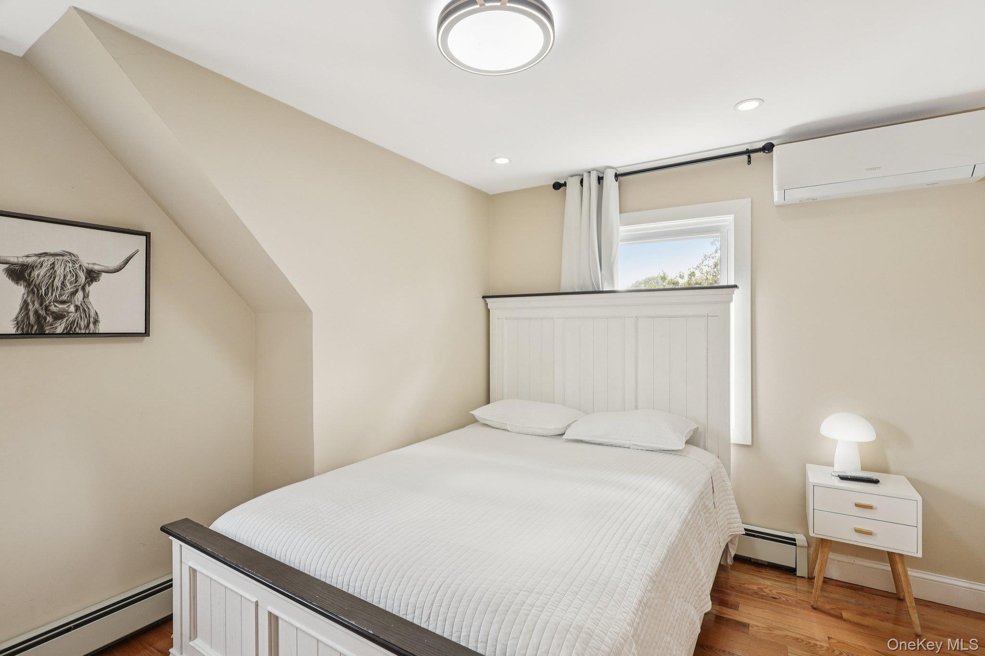 - Bedroom with wood finished floors, a baseboard radiator, recessed lighting, and a wall mounted air conditioner