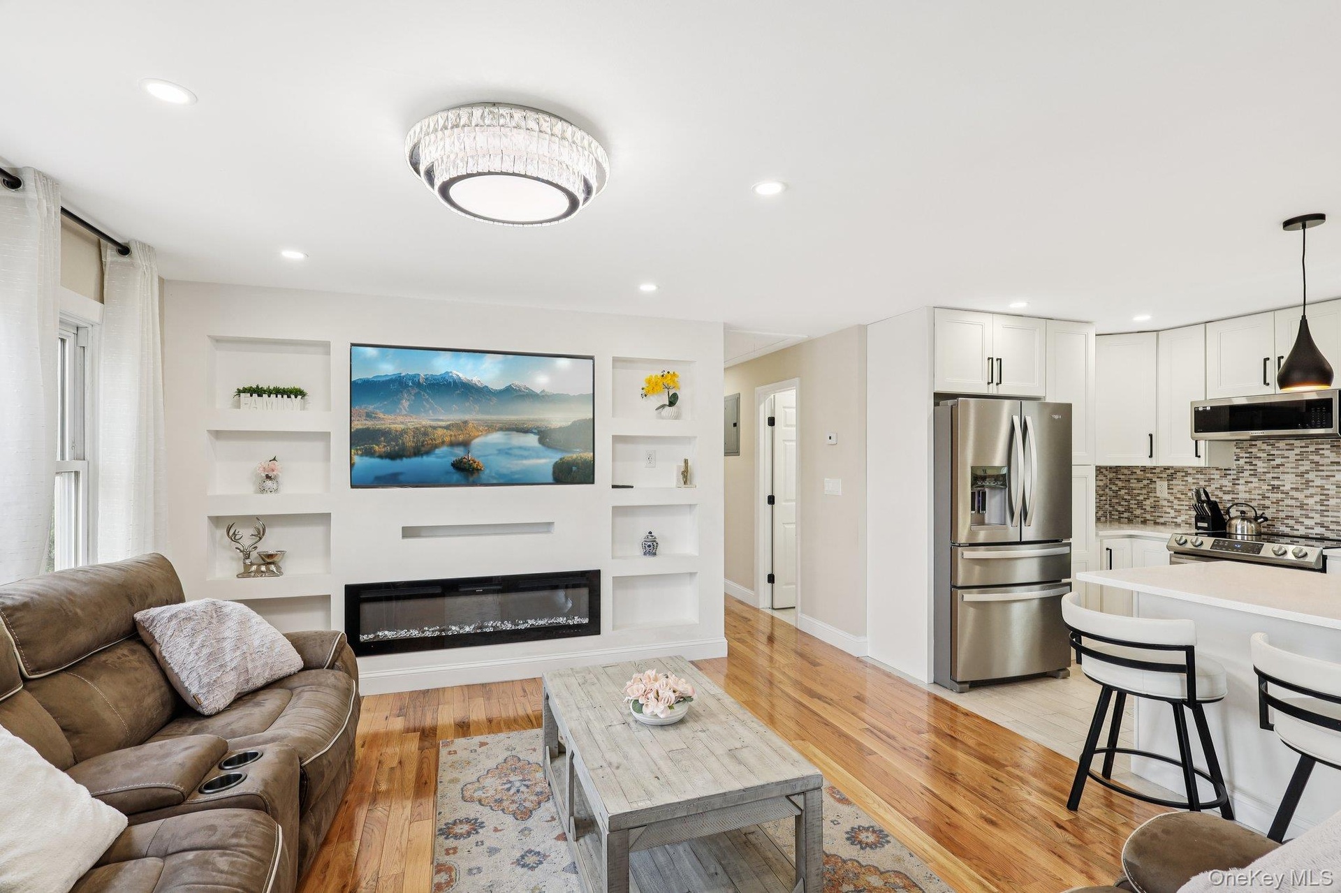 - Living area with a glass covered fireplace, light wood finished floors, built in shelves, and recessed lighting