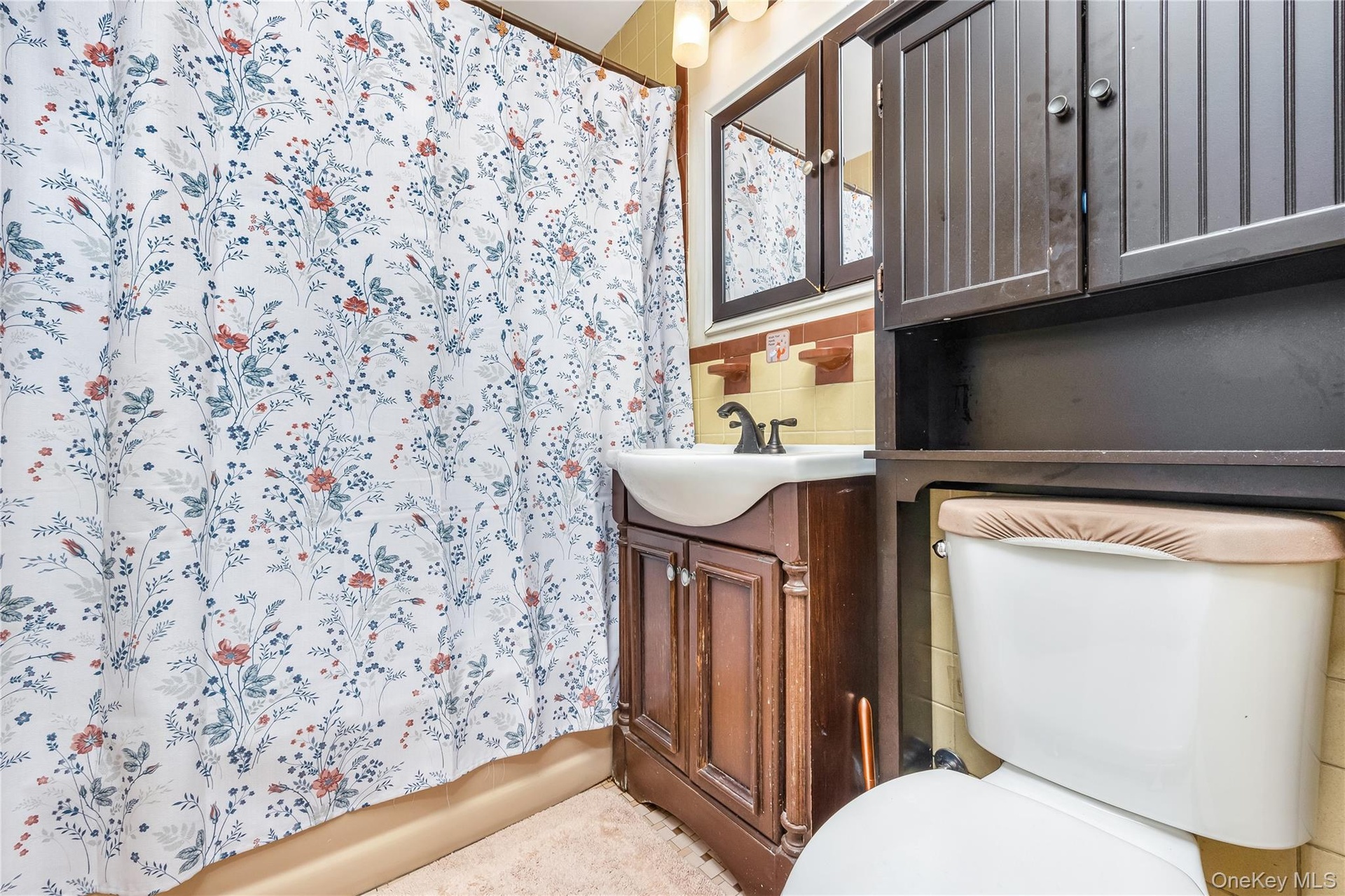 - Full bathroom featuring vanity, curtained shower, and tile walls