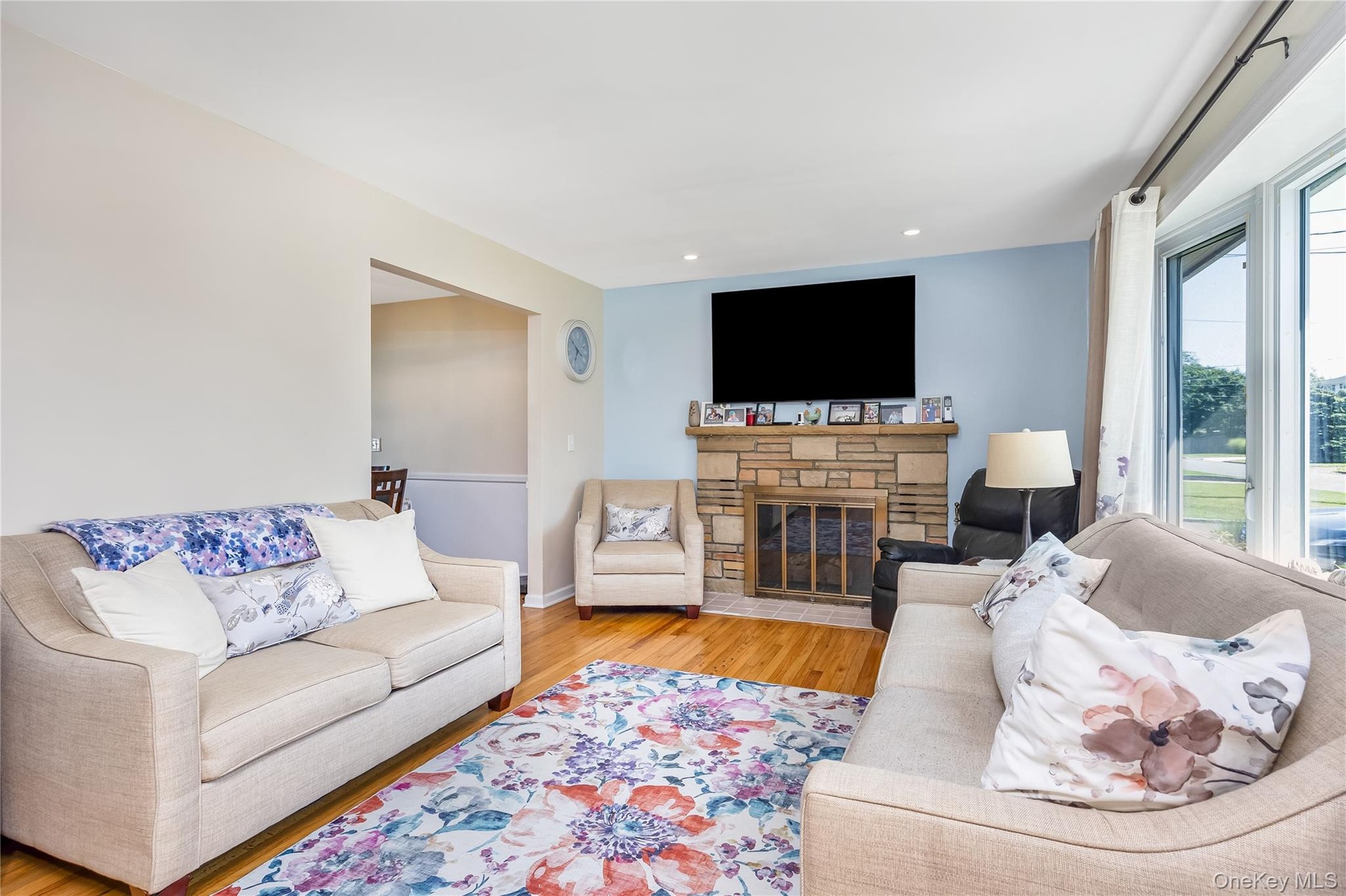 - Living area featuring light wood-type flooring, a fireplace, and recessed lighting