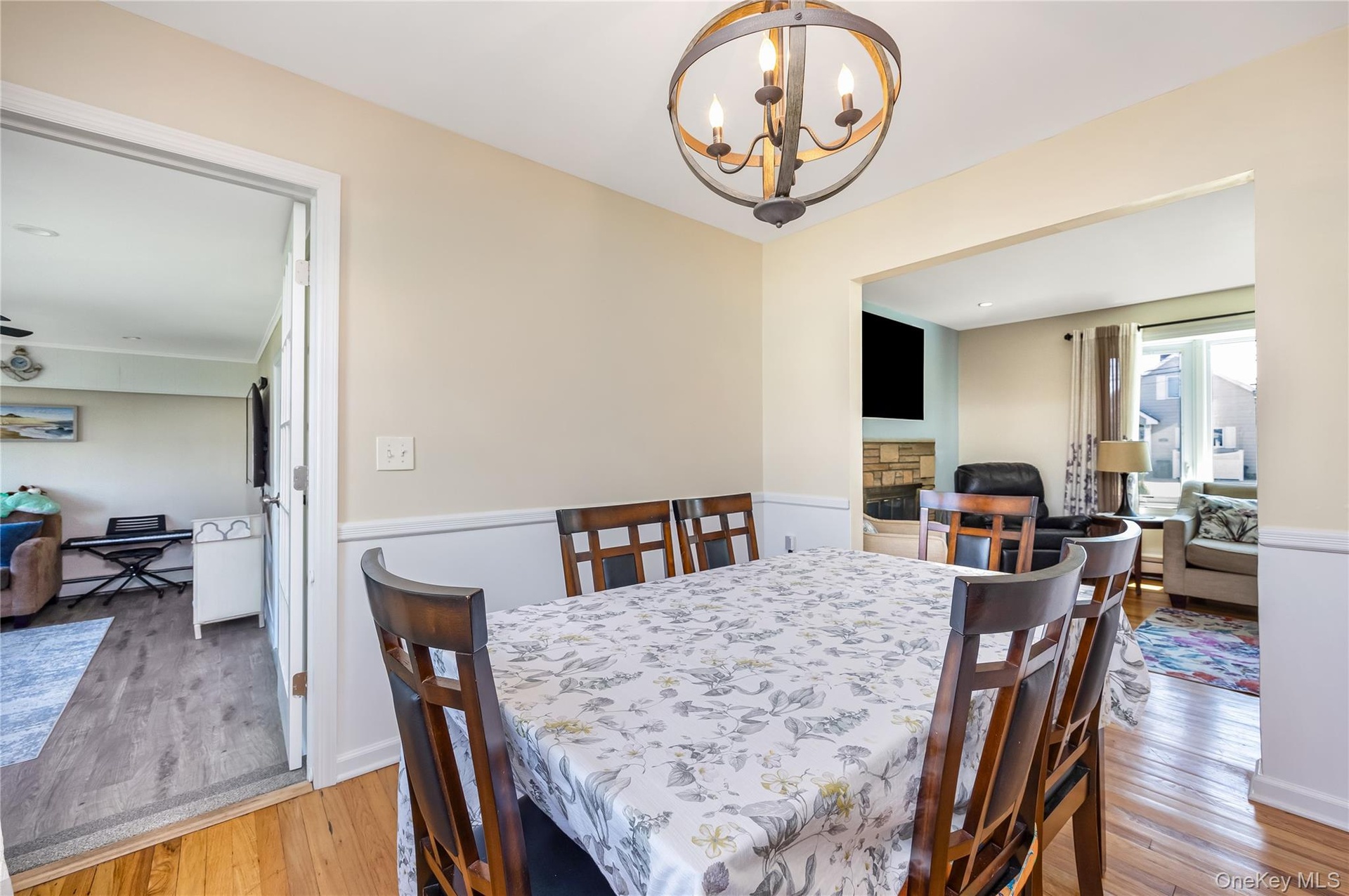 - Dining space with light wood finished floors, a chandelier, and baseboard heating