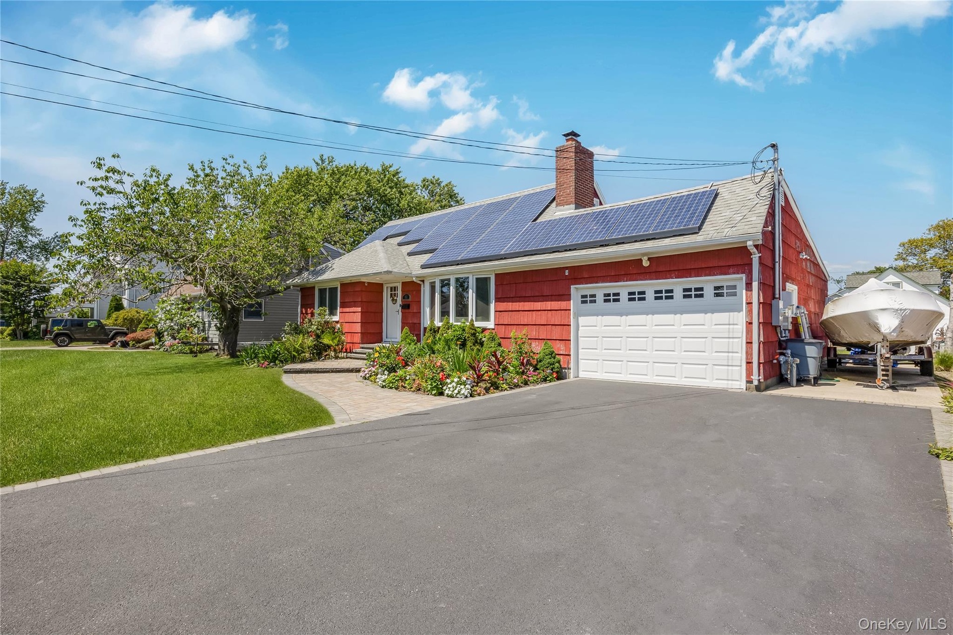 - Ranch-style home with an attached garage, driveway, a chimney, and roof mounted solar panels