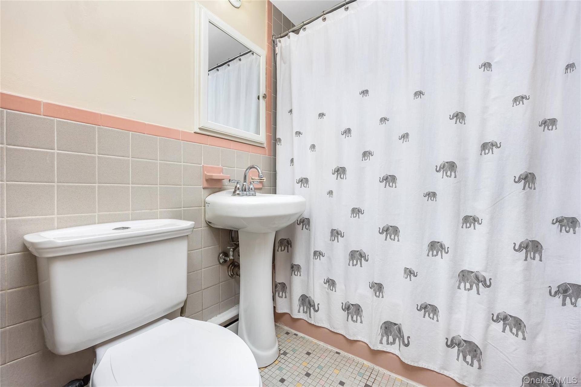 - Bathroom with tile walls, tile patterned floors, a shower with shower curtain, a wainscoted wall, and baseboard heating