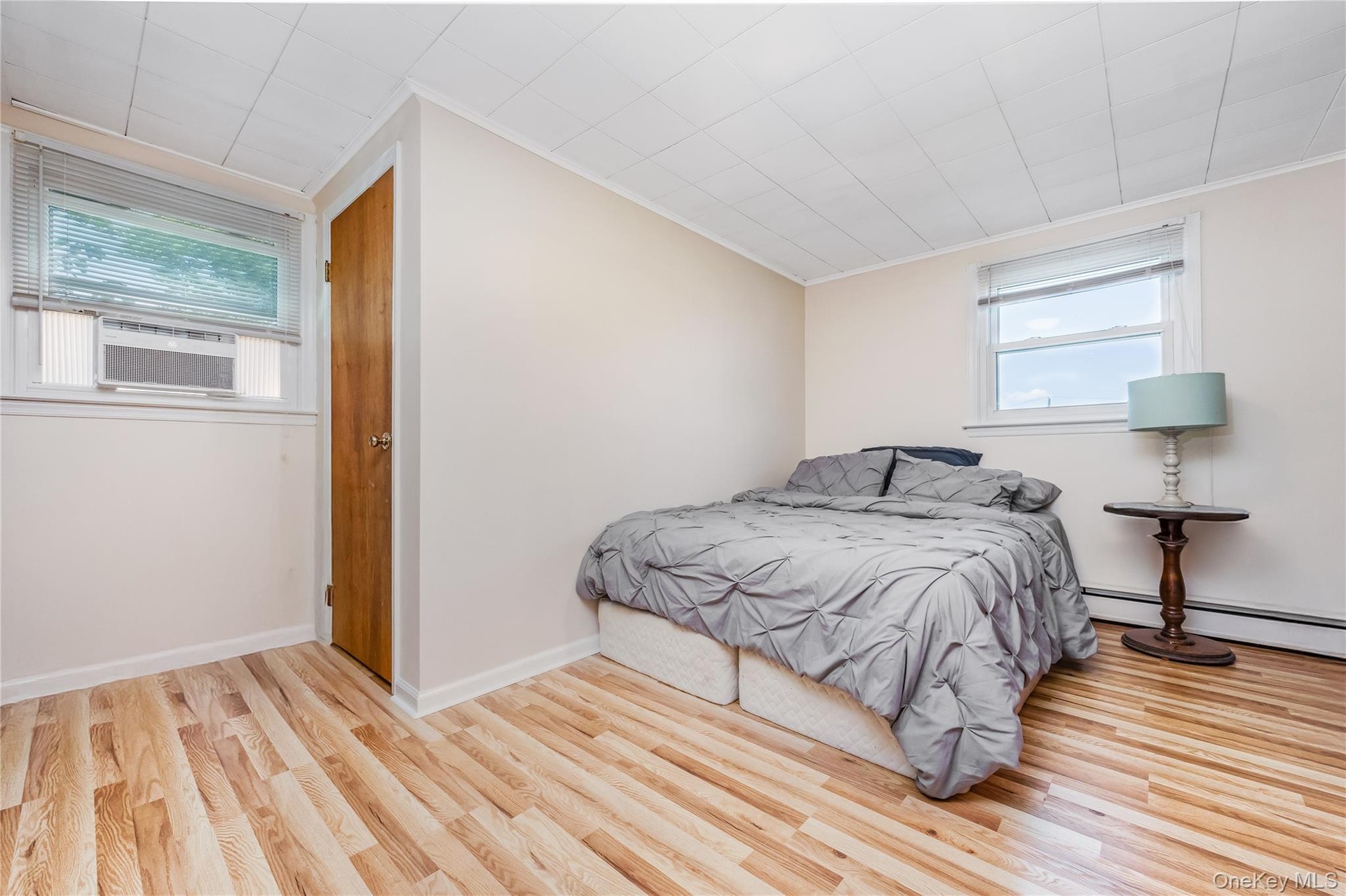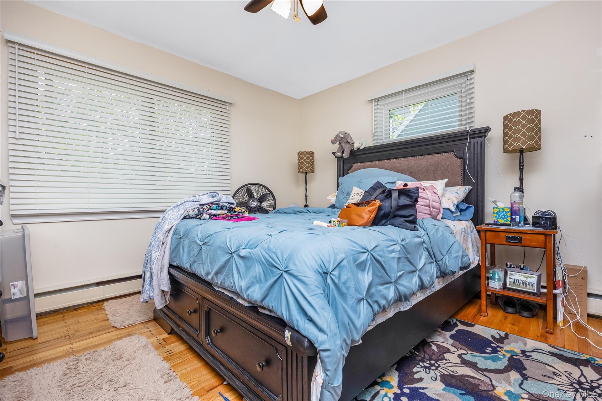 - Bedroom featuring a baseboard radiator, light wood-type flooring, and ceiling fan