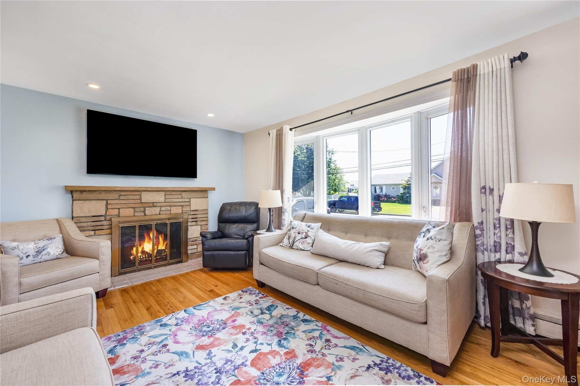- Living area featuring wood finished floors, a stone fireplace, and recessed lighting