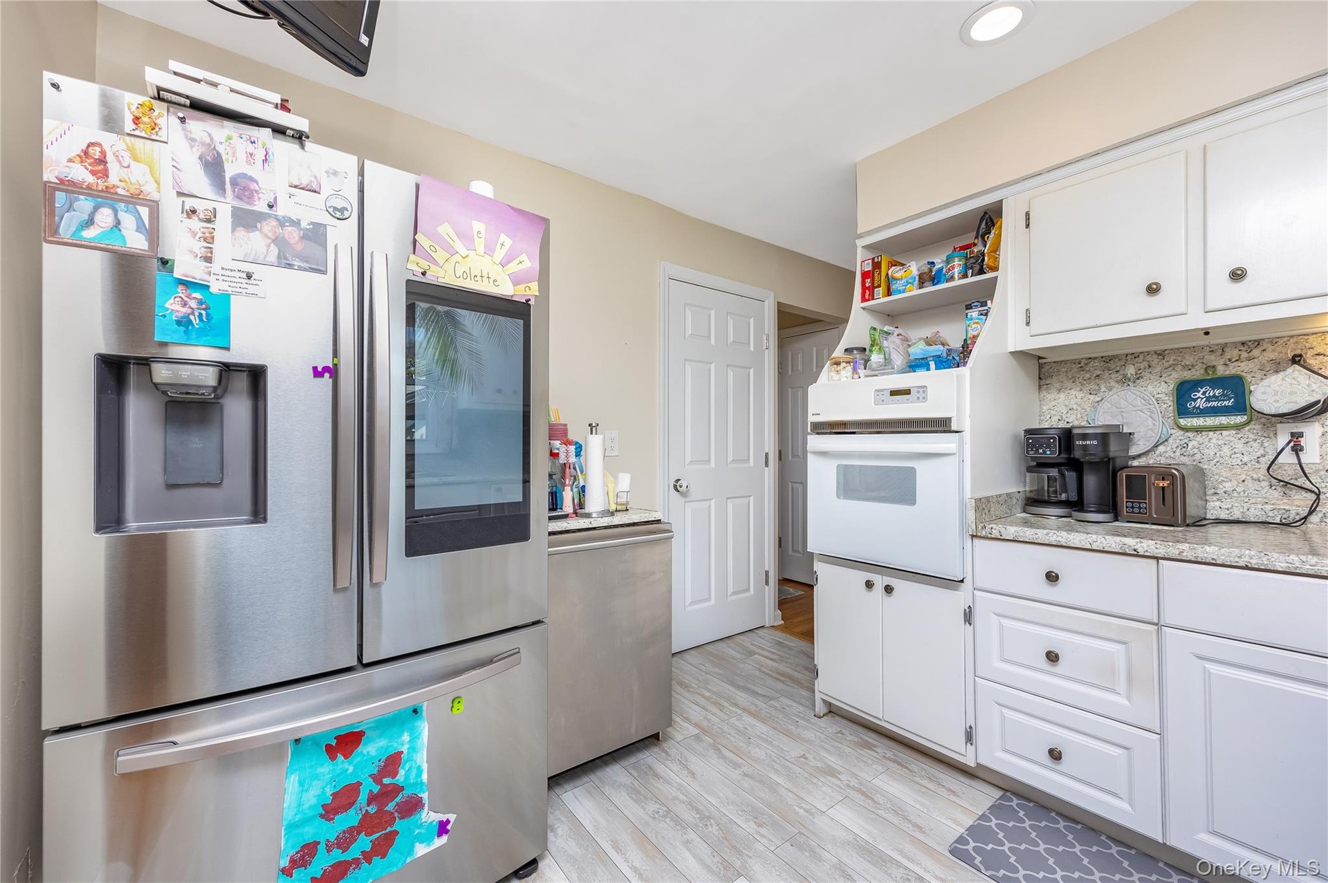 - Kitchen featuring stainless steel fridge, white oven, backsplash, and white cabinets