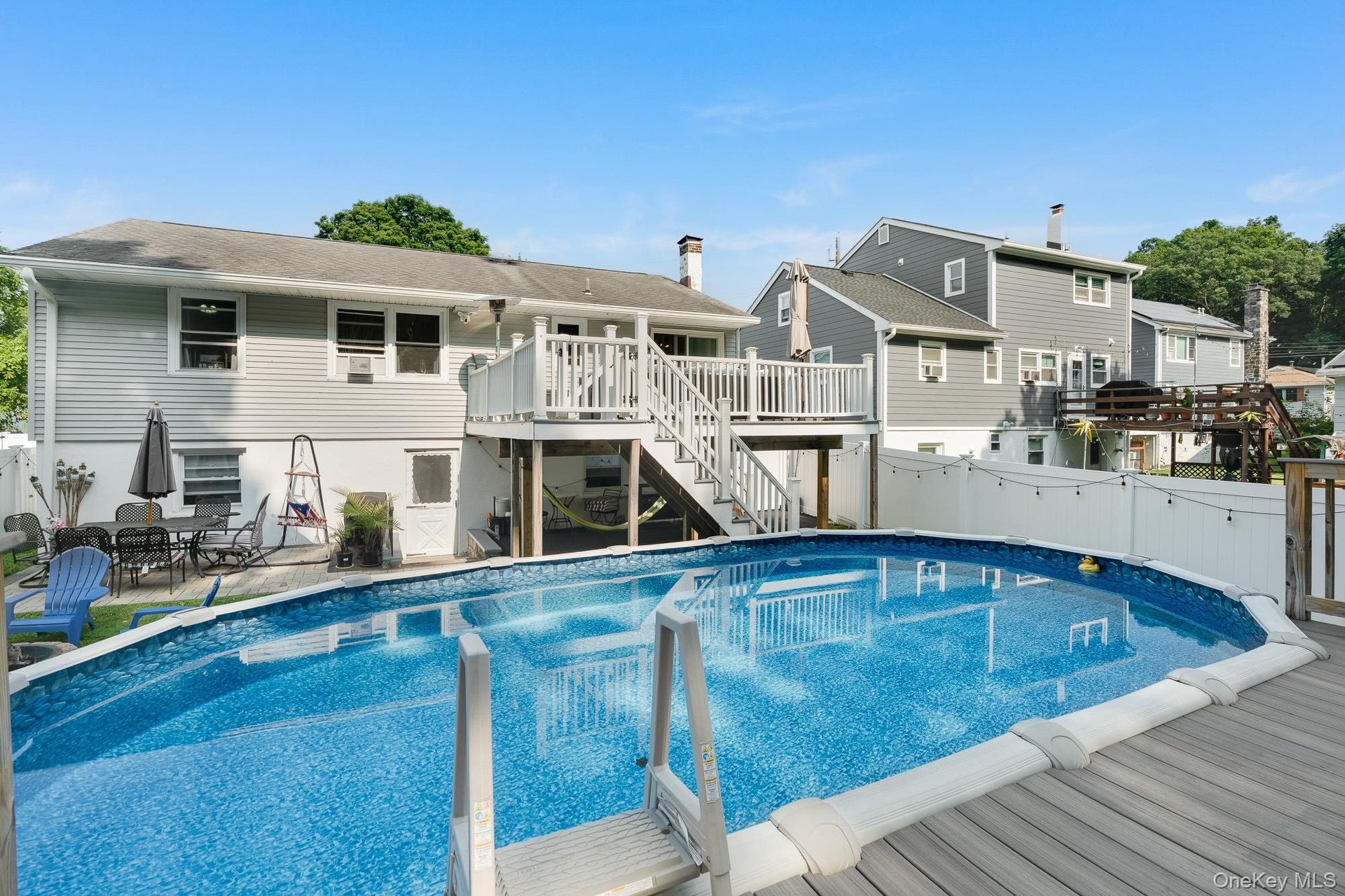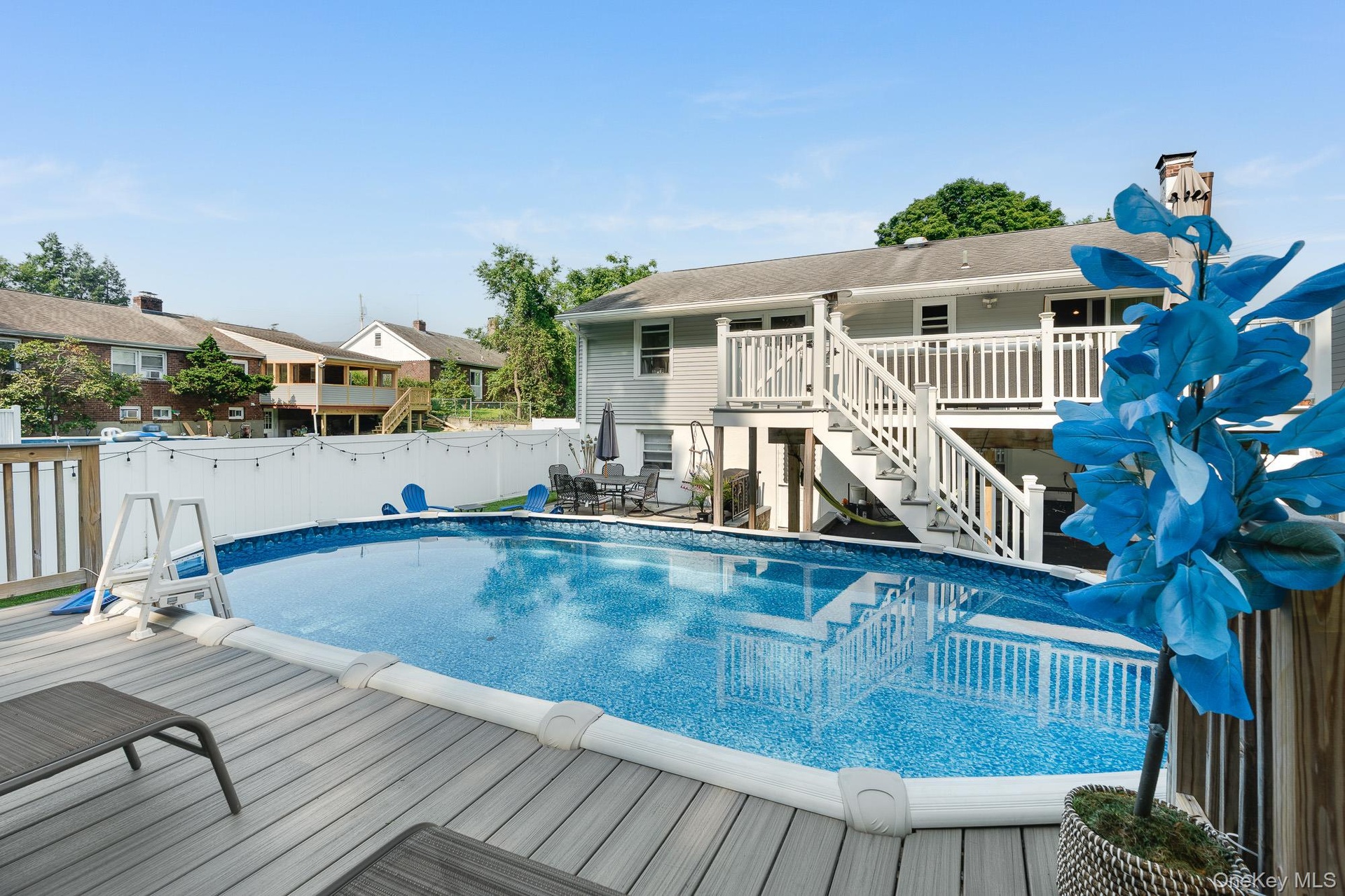 - Swimming pool featuring a deck, stairs, a fenced backyard, and a patio area