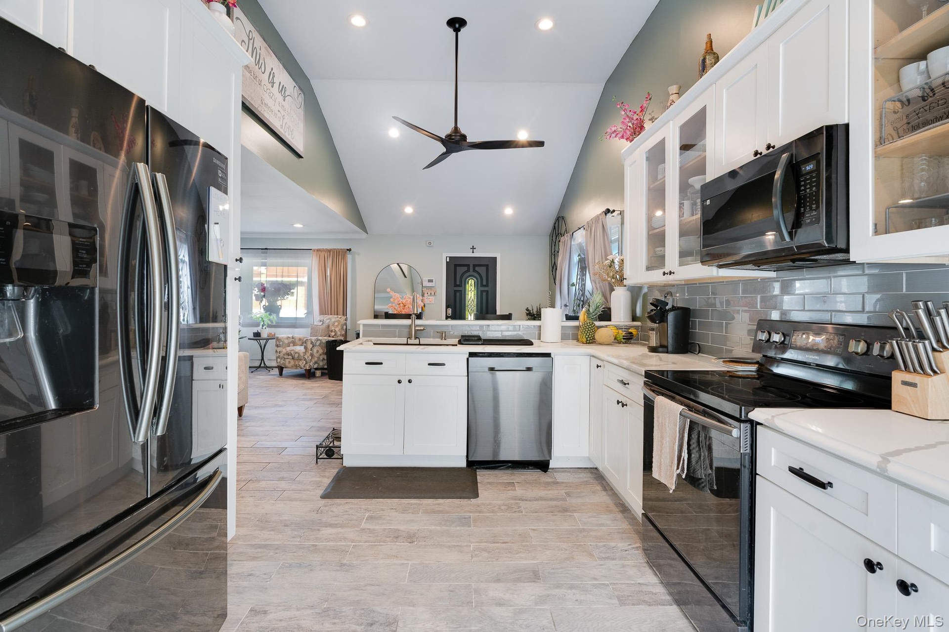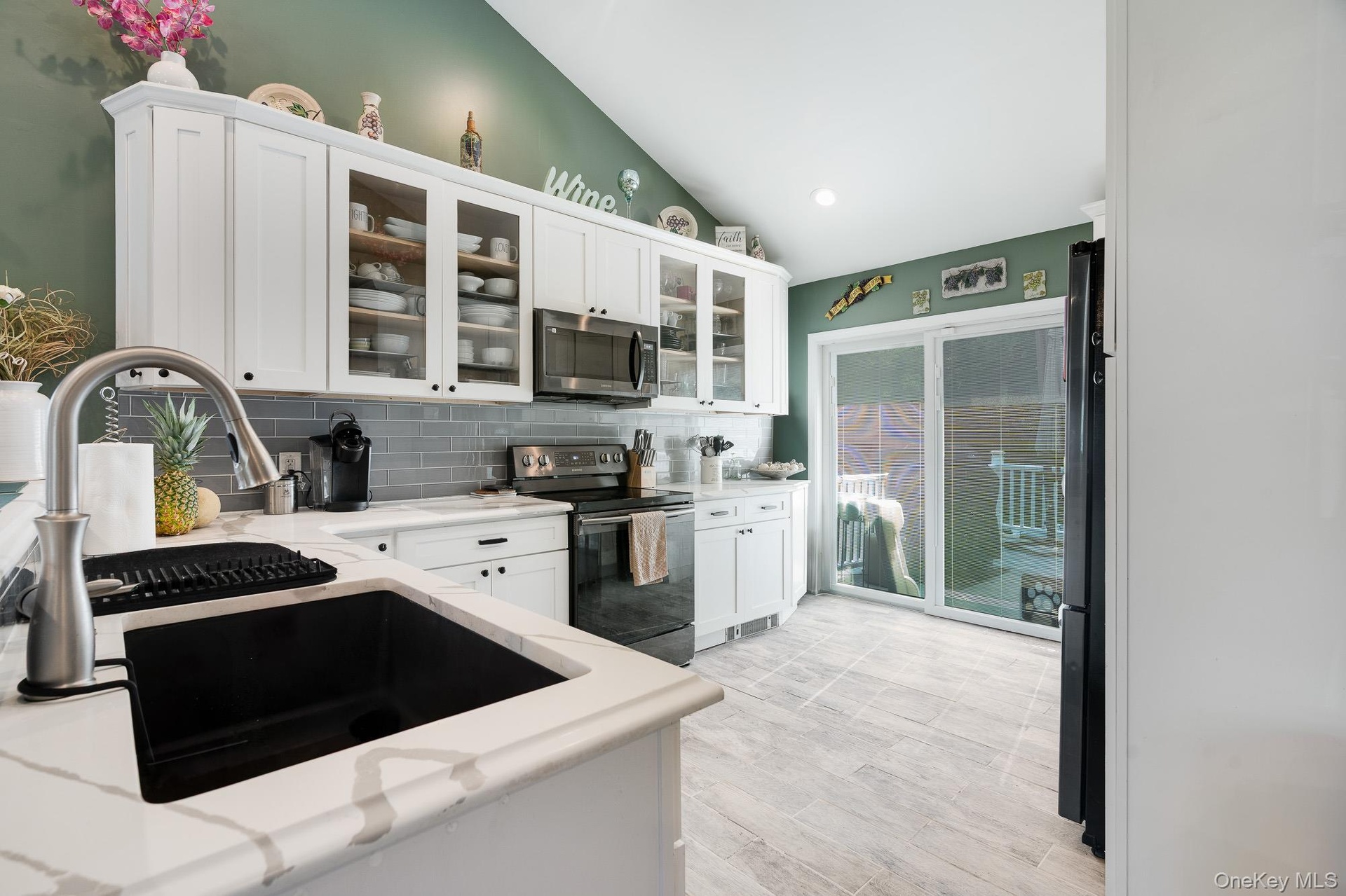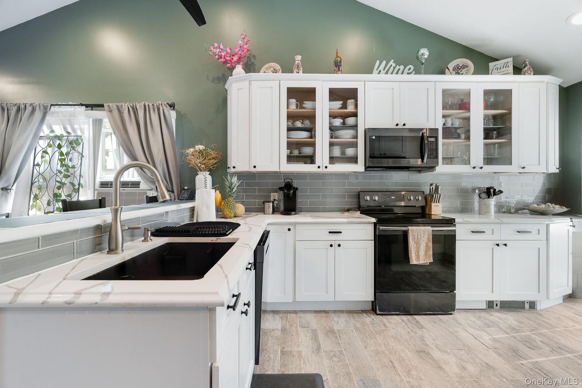 - Kitchen with black / electric stove, stainless steel microwave, tasteful backsplash, vaulted ceiling, and white cabinets