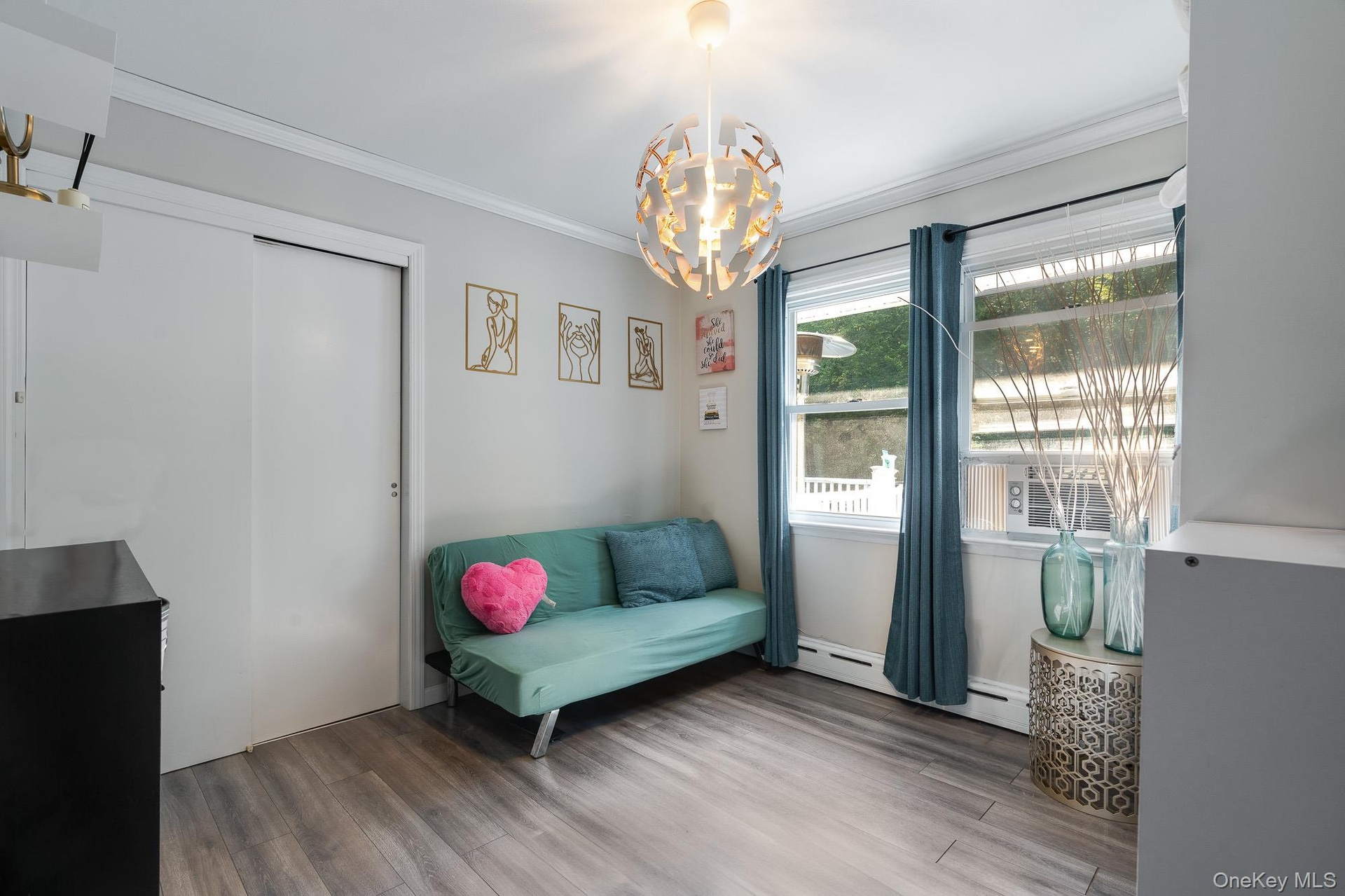 - Sitting room with ornamental molding, wood finished floors, baseboard heating, and a chandelier