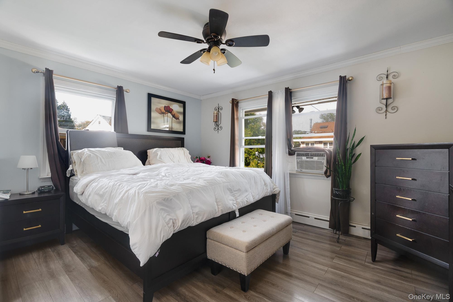 - Bedroom with crown molding, wood finished floors, a ceiling fan, cooling unit, and a baseboard heating unit