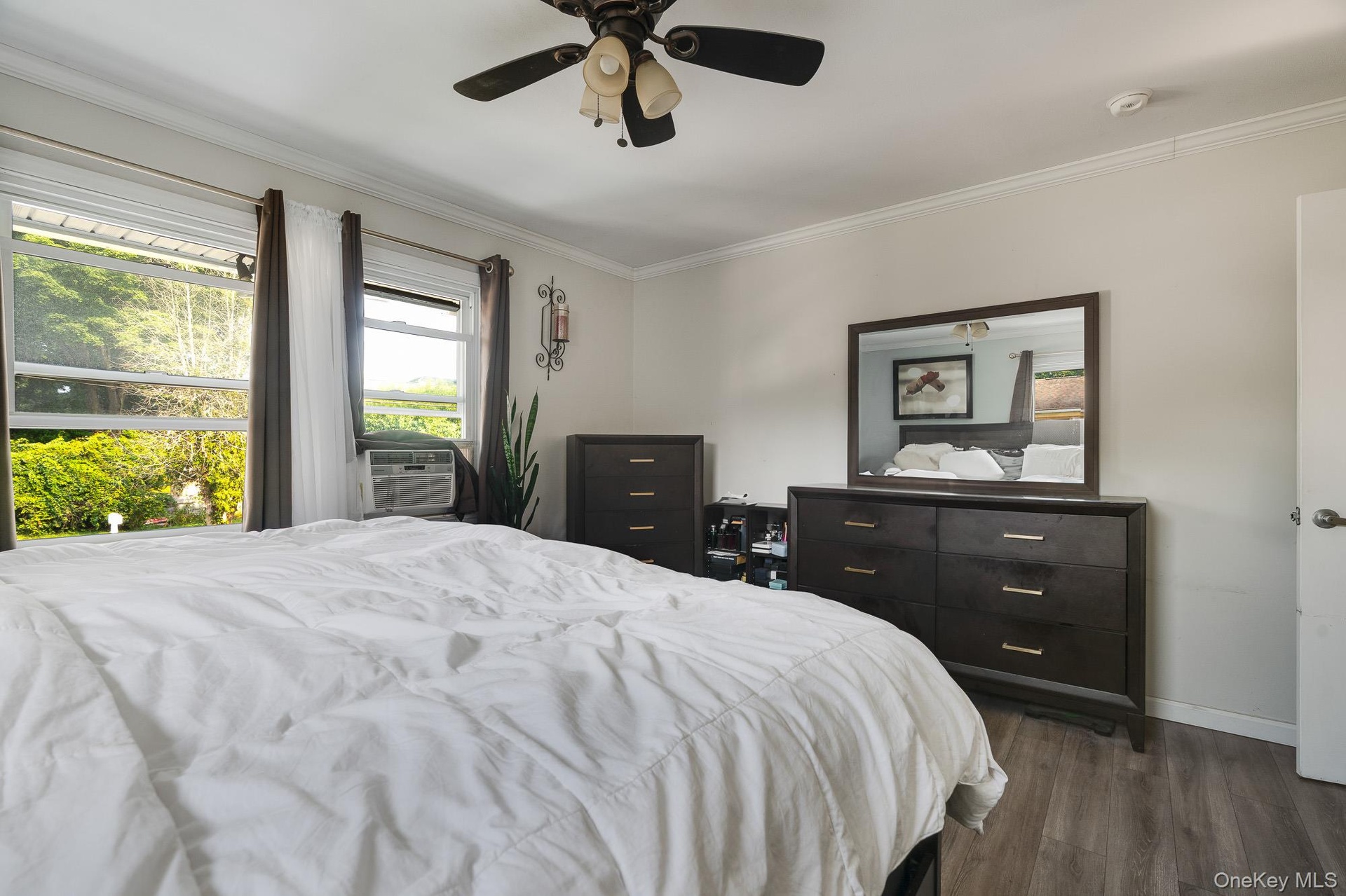 - Bedroom with crown molding, dark wood-style flooring, multiple windows, cooling unit, and a ceiling fan