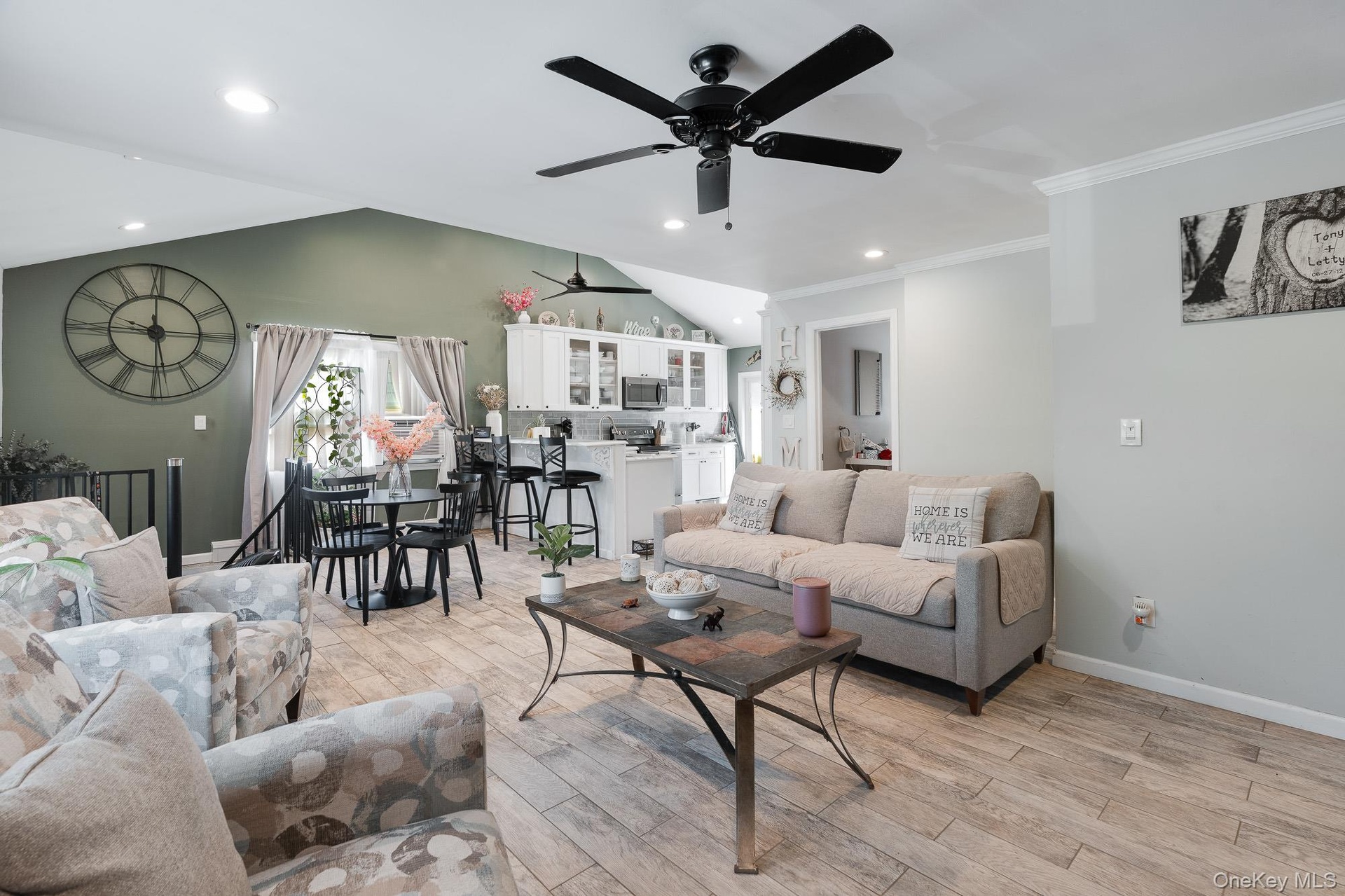 - Living room featuring light wood-type flooring, lofted ceiling, recessed lighting, and ceiling fan