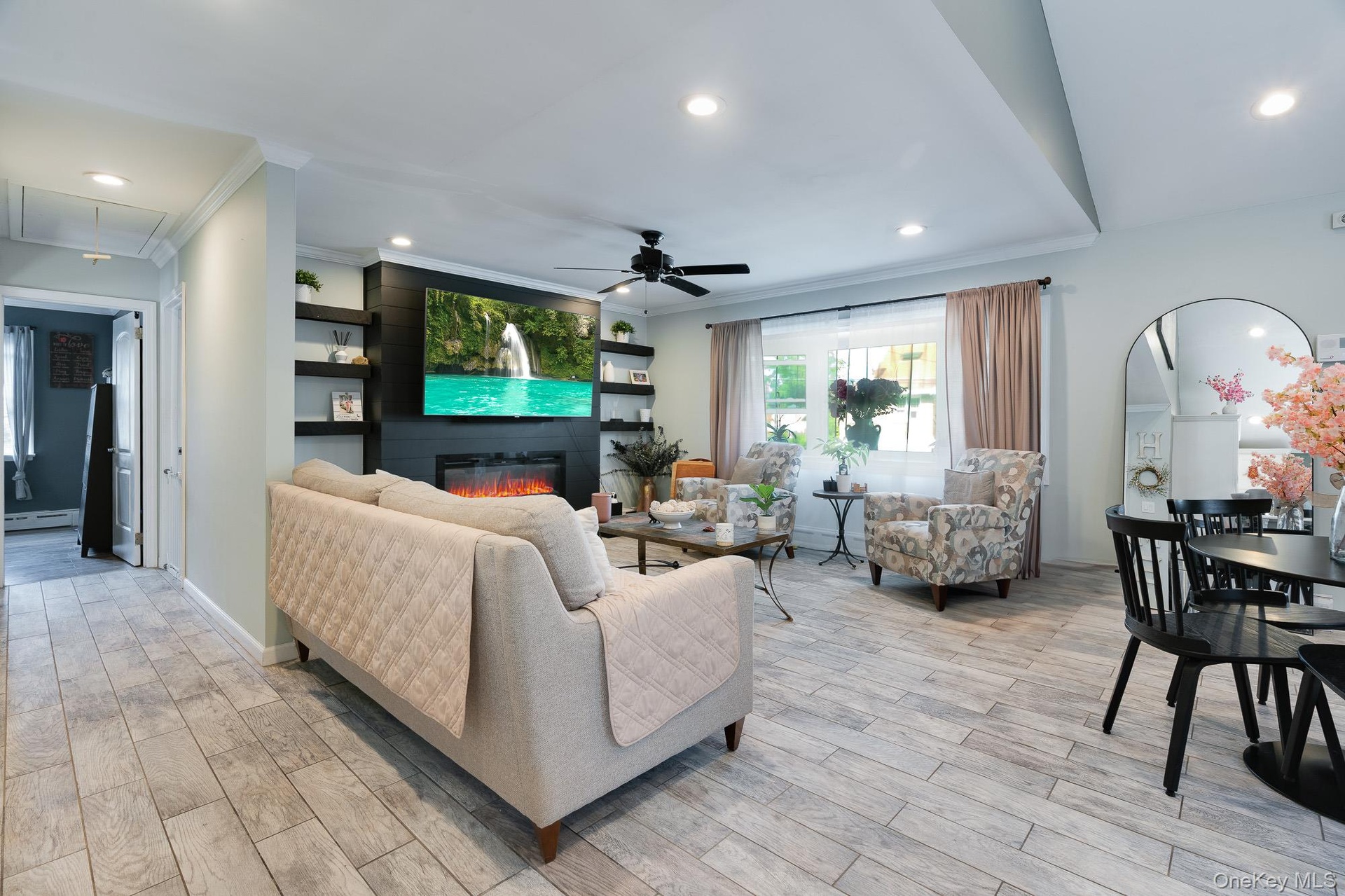 - Living area with light wood finished floors, ornamental molding, a fireplace, recessed lighting, and ceiling fan