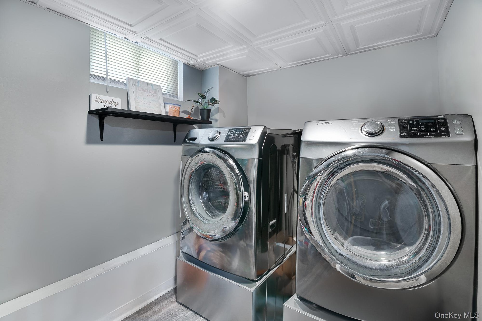 - Washroom featuring washing machine and dryer, an ornate ceiling, and wood finished floors