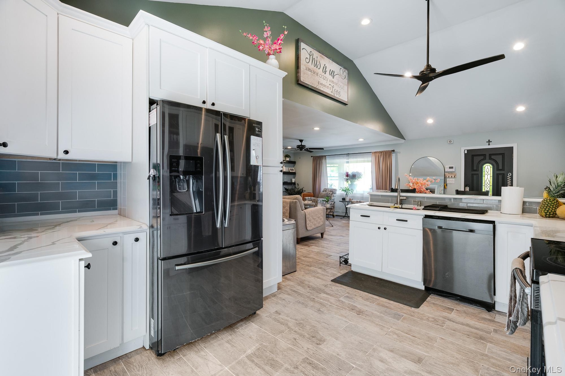 - Kitchen with backsplash, stainless steel appliances, vaulted ceiling, light stone counters, and white cabinets