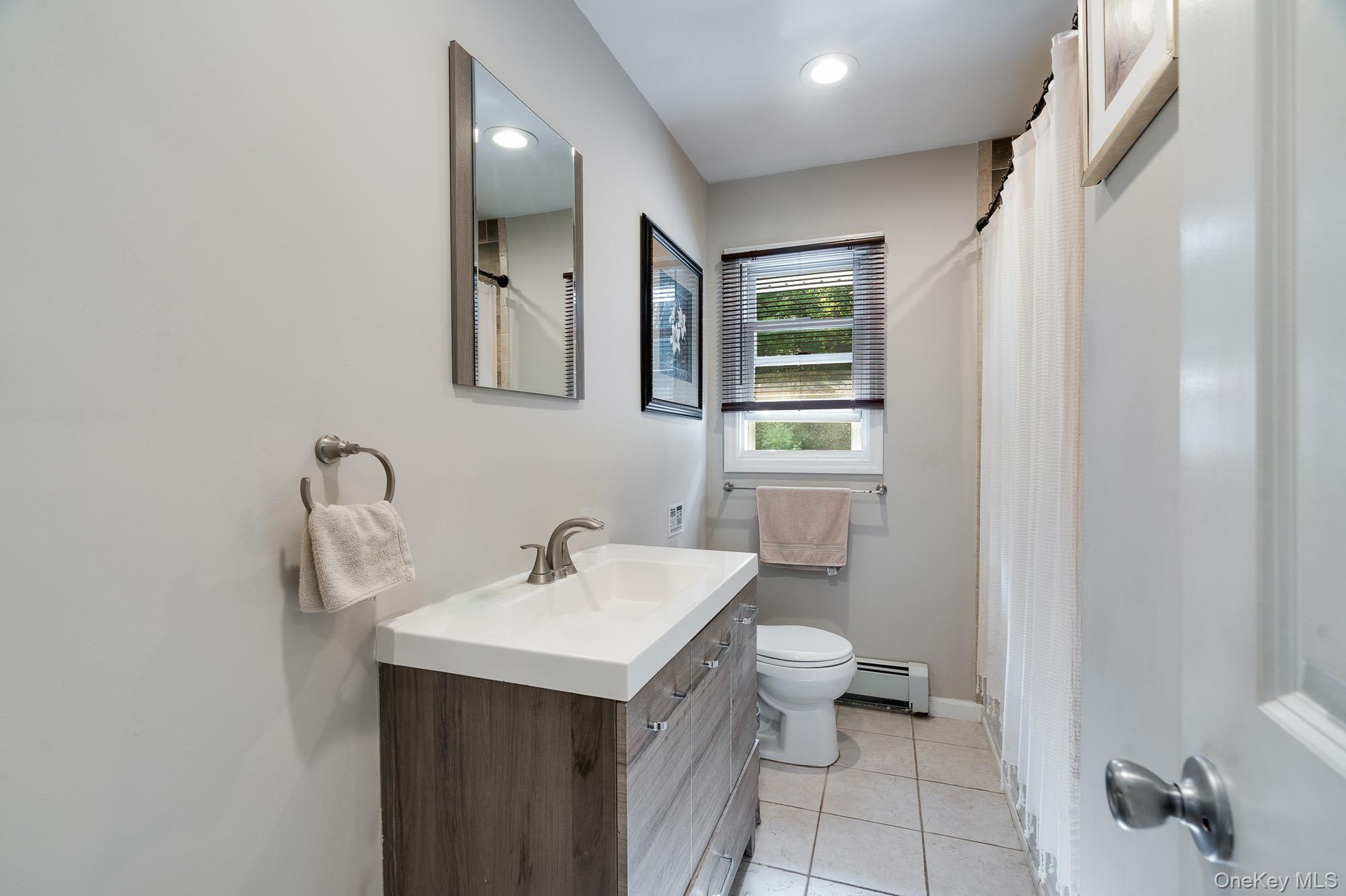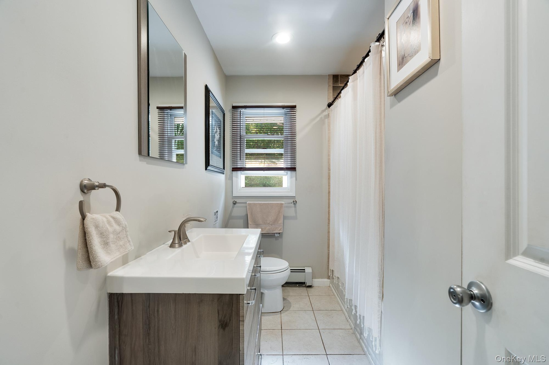 - Full bathroom with tile patterned flooring, vanity, a baseboard heating unit, and curtained shower