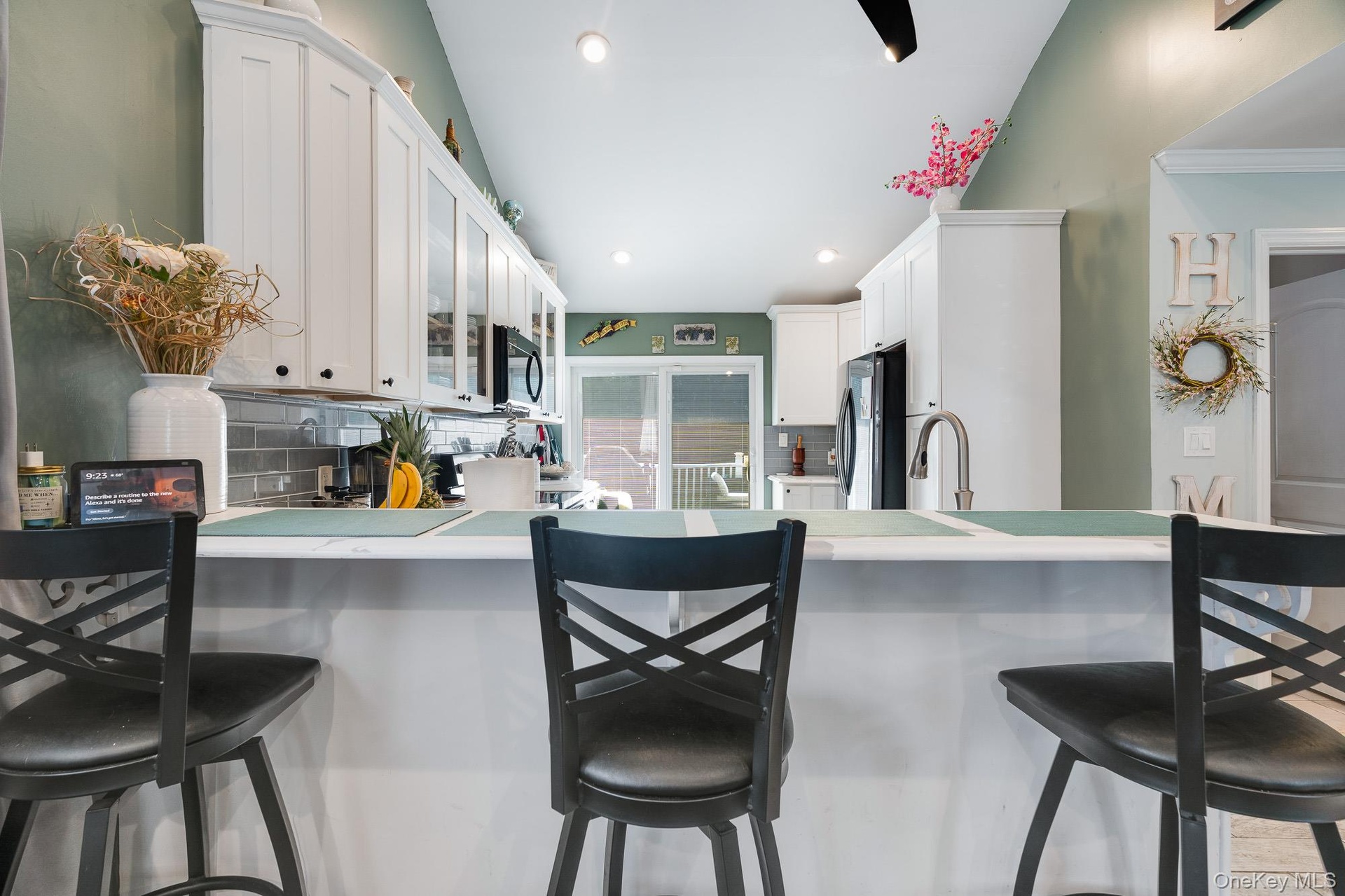 - Kitchen with backsplash, a peninsula, white cabinetry, a kitchen breakfast bar, and lofted ceiling