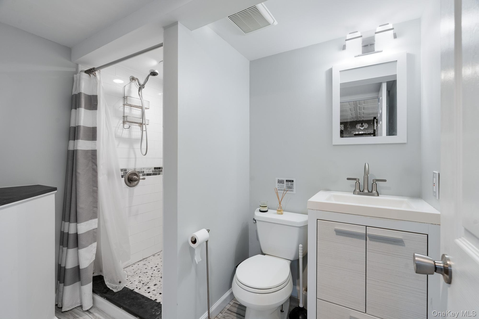 - Bathroom featuring tile patterned floors, vanity, curtained shower, and baseboard heating