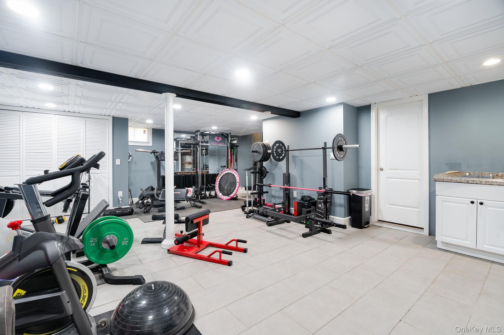 - Exercise room featuring recessed lighting, light tile patterned flooring, and an ornate ceiling