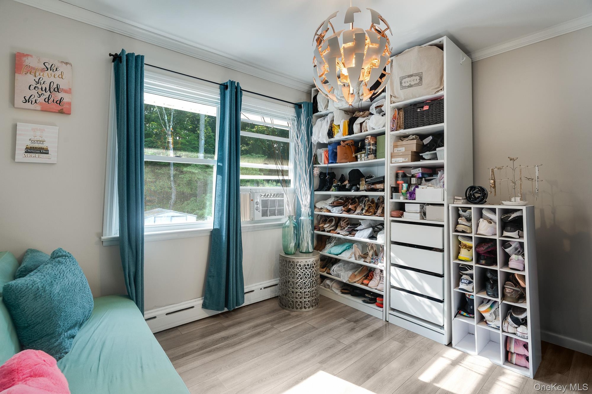 - Spacious closet with wood finished floors, a chandelier, and baseboard heating