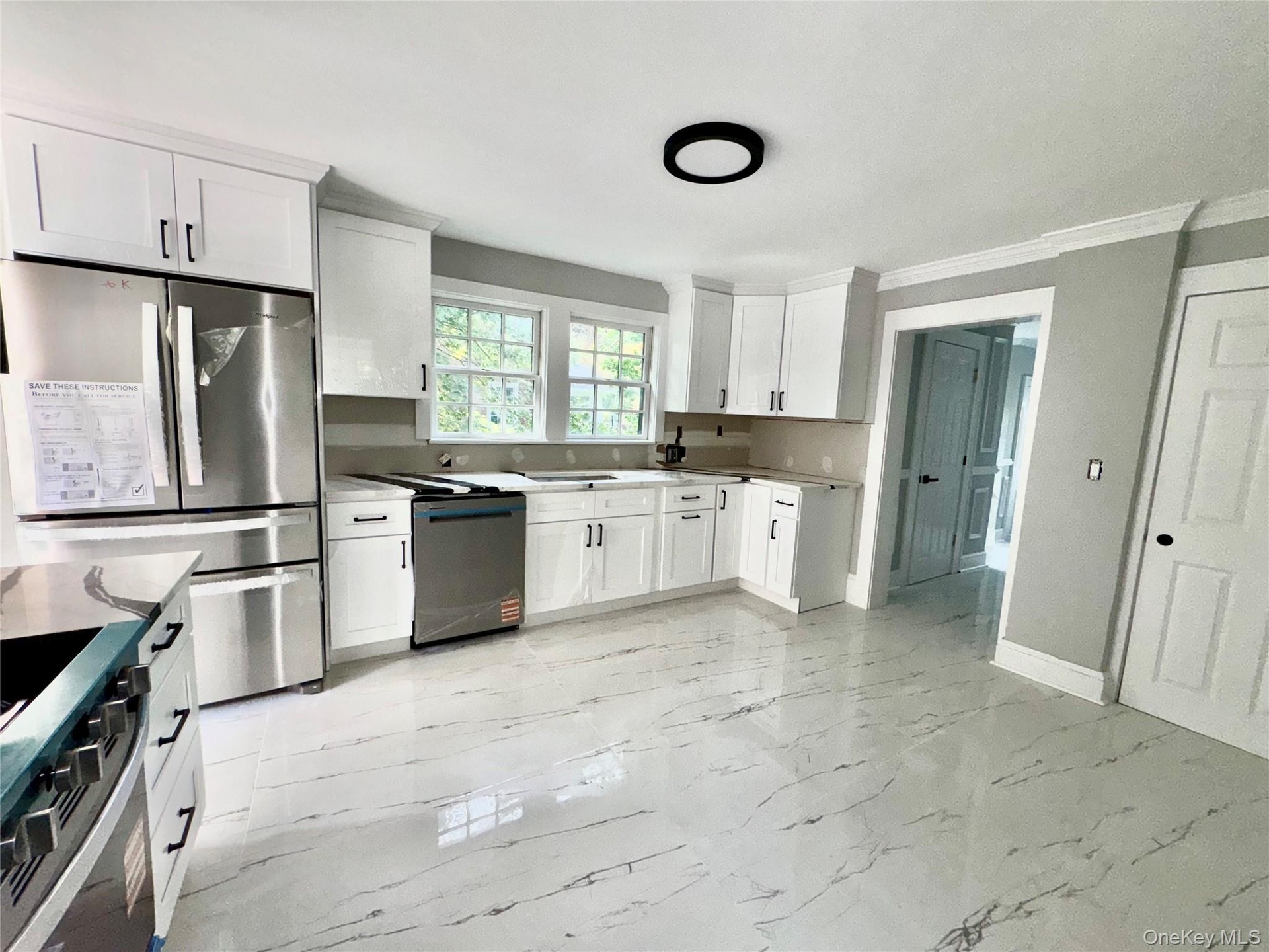 - Kitchen featuring plenty of natural light, stainless steel appliances, white cabinetry, light marble finish floors, and crown molding