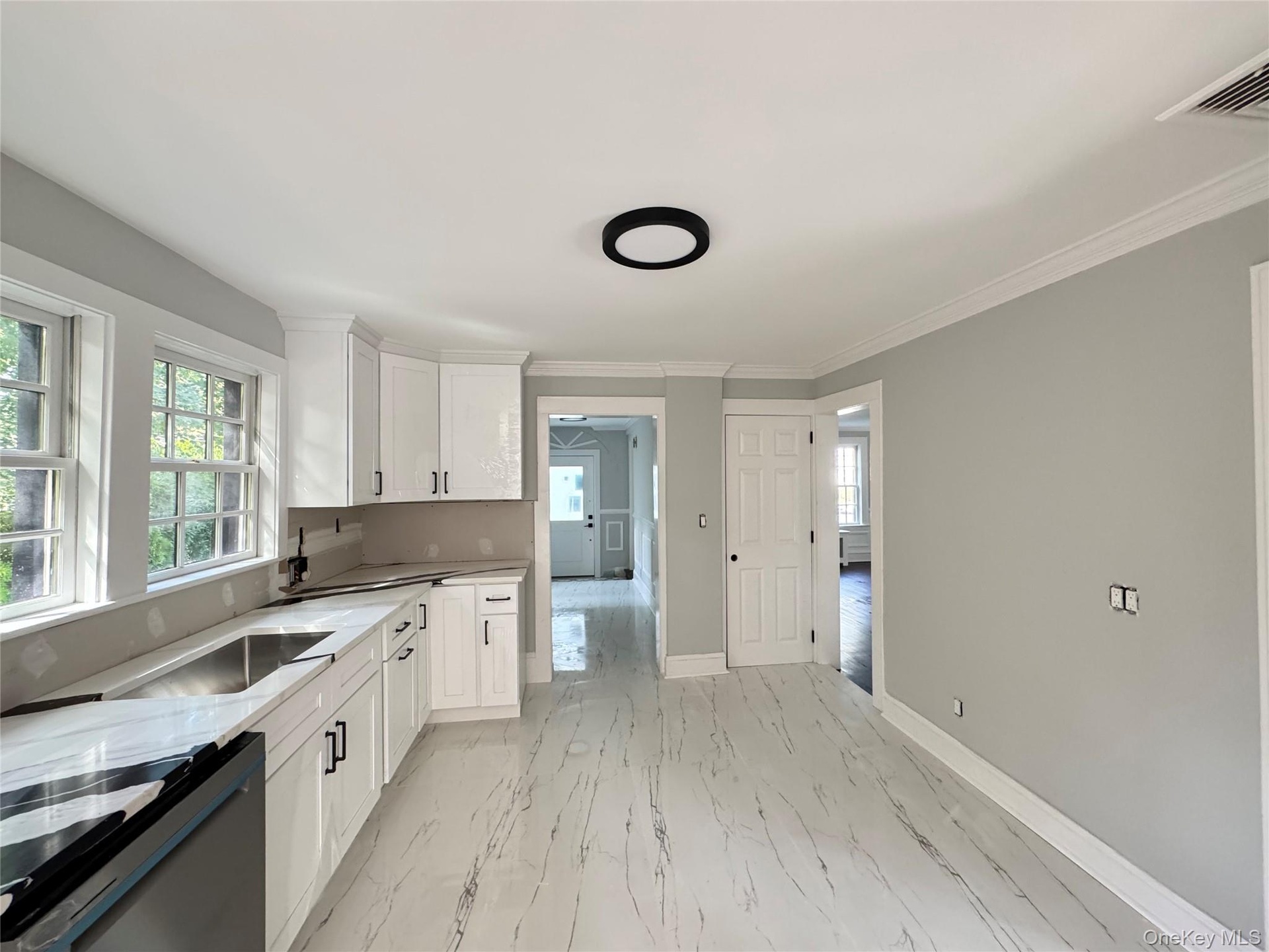 - Kitchen with white cabinetry, healthy amount of natural light, dishwashing machine, light stone counters, and ornamental molding