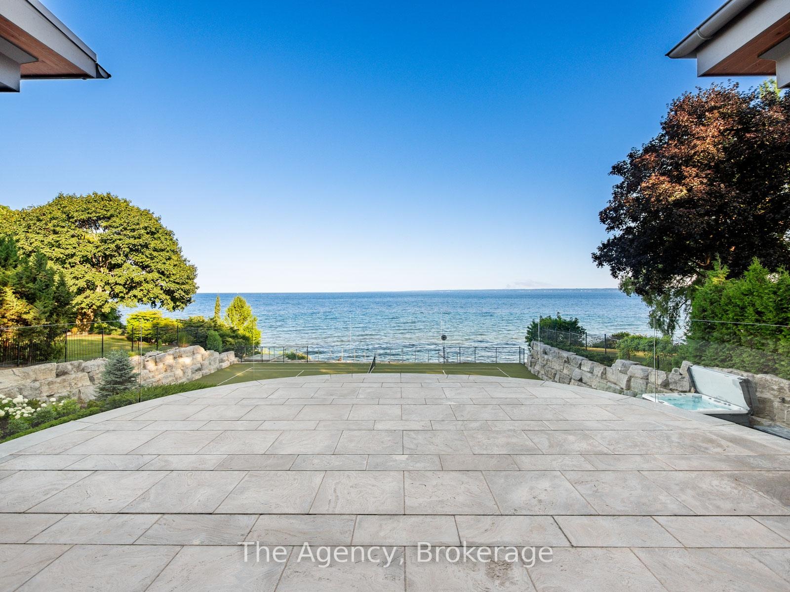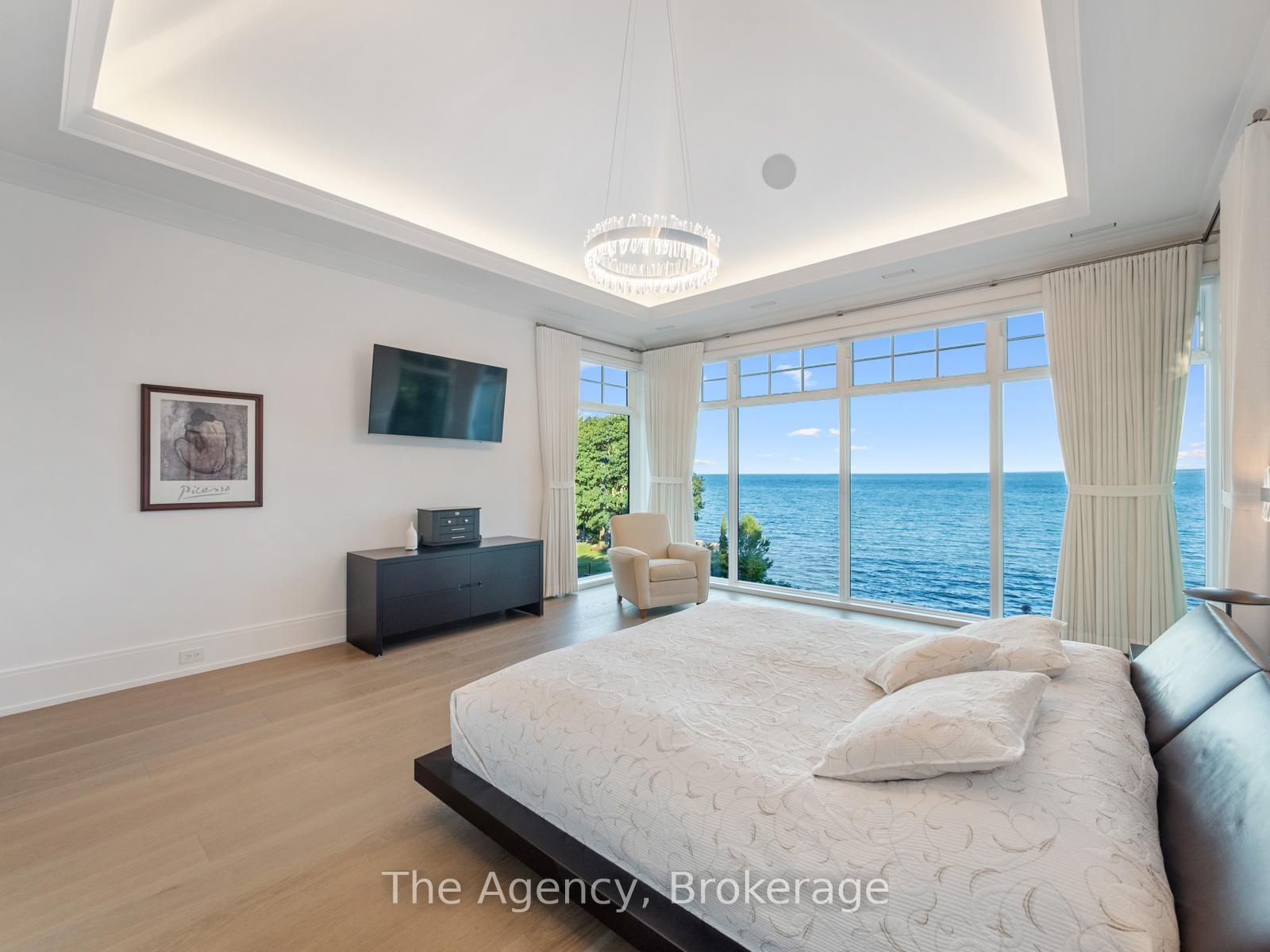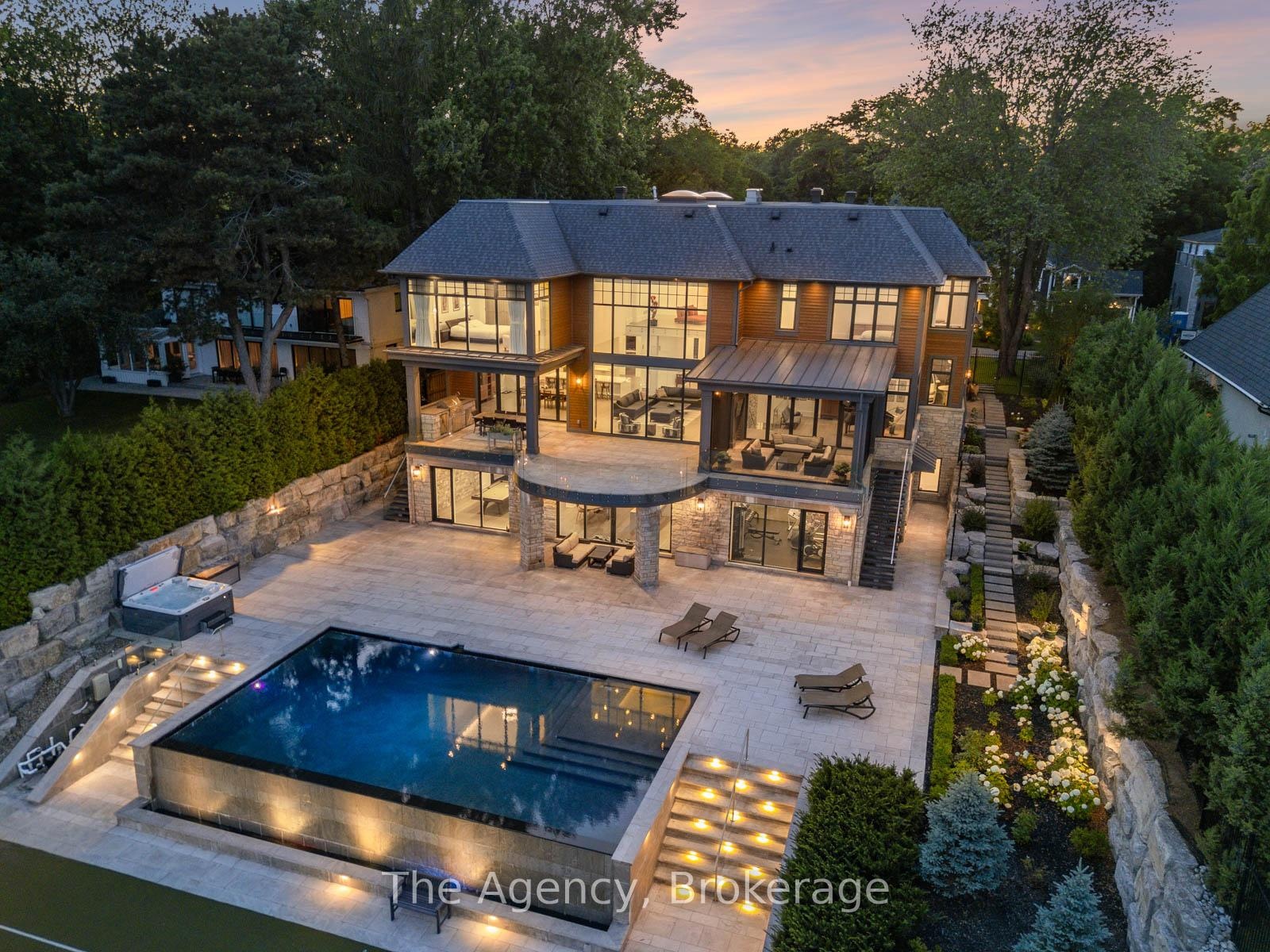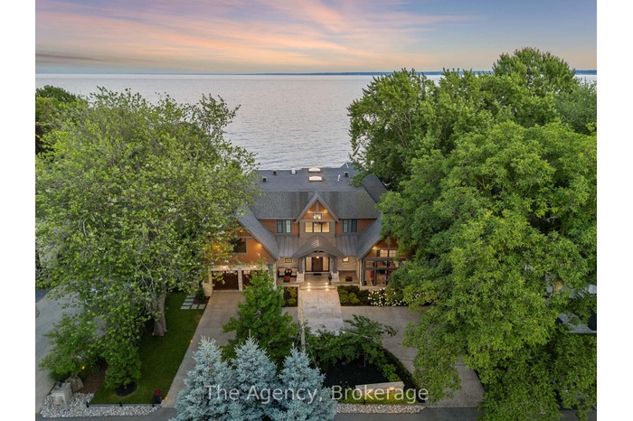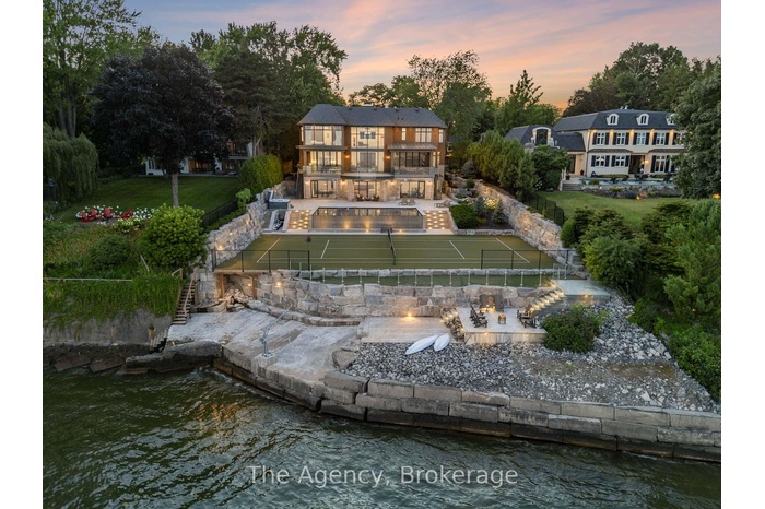 The Haven. A rare waterfront estate on a private laneway in South Burlington. Set on nearly of an acre with 103 ft of shoreline and full riparian rights, this property offers privacy, direct lake access, 11,417 Sq ft of living space and a lifestyle that feels like a luxury resort without leaving home. Inside, the lake takes centre stage. Floor to ceiling windows in the great room frame the view, anchored by 22-foot ceilings, a dramatic full-height stone fireplace, and a skylight that floods the space with light. A second living room provides another place to unwind, while a private office with 18-foot beamed ceilings and a stone feature wall inspires focus. Designed by architect David Small and built by Rock Cliff Custom Homes, this home is a masterclass in craftsmanship and elegance.Details like radiant heated floors throughout and a heated driveway ensure year-round comfort.Three outdoor terraces extend the living space.One includes a full outdoor kitchen with built-in BBQ, fridge, and bar sink; another is heated and screened for cooler nights.An additional custom stone patio sits at the waters edge.The backyard is a showstopper.An infinity edge pool appears to spill into the lake, while a private tennis court adds to the resort feel.Inside the kitchen features a large quartz island, Sub- Zero, Miele, and Wolf appliances, and custom cabinetry.A generous mudroom and main-floor laundry offer everyday function.Upstairs are four bedrooms, each with its own ensuite.The primary suite enjoys panoramic lake views, a spa-like ensuite, and a custom dressing room with center island.A second laundry room is also on this level.The walk-out lower level includes a lounge and bar, wine cellar, golf simulator, gym with lake views, sauna, tiered theatre, guest suite, and 3 additional bathrooms.An oversized 4-car tandem garage completes the home.Just minutes to downtown Burlington and a short drive to Toronto and Niagara, this is lakeside living without compromise. Luxury Certified
