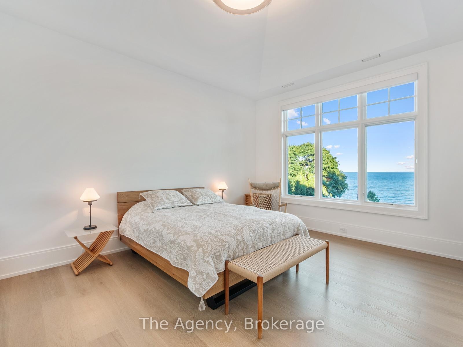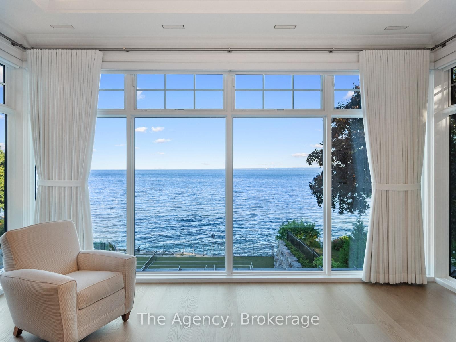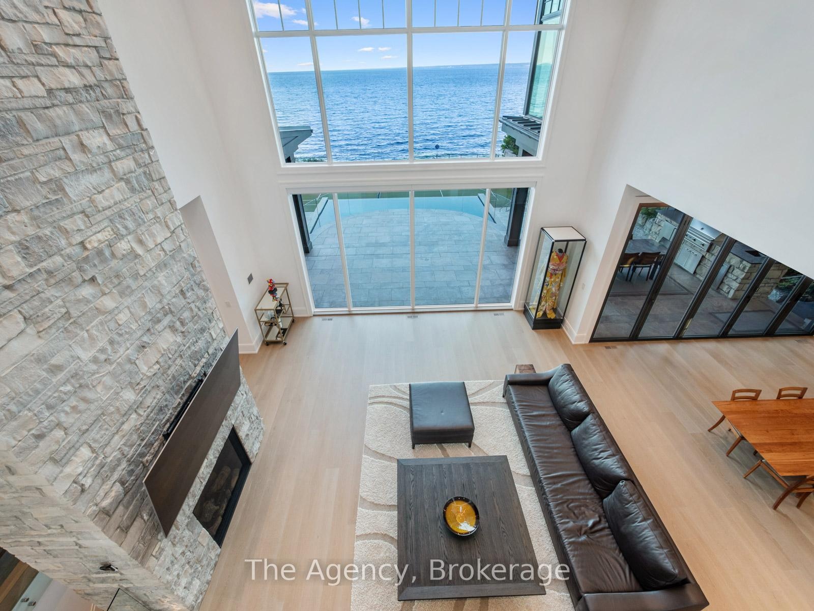 The Haven. A rare waterfront estate on a private laneway in South Burlington. Set on nearly of an acre with 103 ft of shoreline and full riparian rights, this property offers privacy, direct lake access, 11,417 Sq ft of living space and a lifestyle that feels like a luxury resort without leaving home. Inside, the lake takes centre stage. Floor to ceiling windows in the great room frame the view, anchored by 22-foot ceilings, a dramatic full-height stone fireplace, and a skylight that floods the space with light. A second living room provides another place to unwind, while a private office with 18-foot beamed ceilings and a stone feature wall inspires focus. Designed by architect David Small and built by Rock Cliff Custom Homes, this home is a masterclass in craftsmanship and elegance.Details like radiant heated floors throughout and a heated driveway ensure year-round comfort.Three outdoor terraces extend the living space.One includes a full outdoor kitchen with built-in BBQ, fridge, and bar sink; another is heated and screened for cooler nights.An additional custom stone patio sits at the waters edge.The backyard is a showstopper.An infinity edge pool appears to spill into the lake, while a private tennis court adds to the resort feel.Inside the kitchen features a large quartz island, Sub- Zero, Miele, and Wolf appliances, and custom cabinetry.A generous mudroom and main-floor laundry offer everyday function.Upstairs are four bedrooms, each with its own ensuite.The primary suite enjoys panoramic lake views, a spa-like ensuite, and a custom dressing room with center island.A second laundry room is also on this level.The walk-out lower level includes a lounge and bar, wine cellar, golf simulator, gym with lake views, sauna, tiered theatre, guest suite, and 3 additional bathrooms.An oversized 4-car tandem garage completes the home.Just minutes to downtown Burlington and a short drive to Toronto and Niagara, this is lakeside living without compromise. Luxury Certified