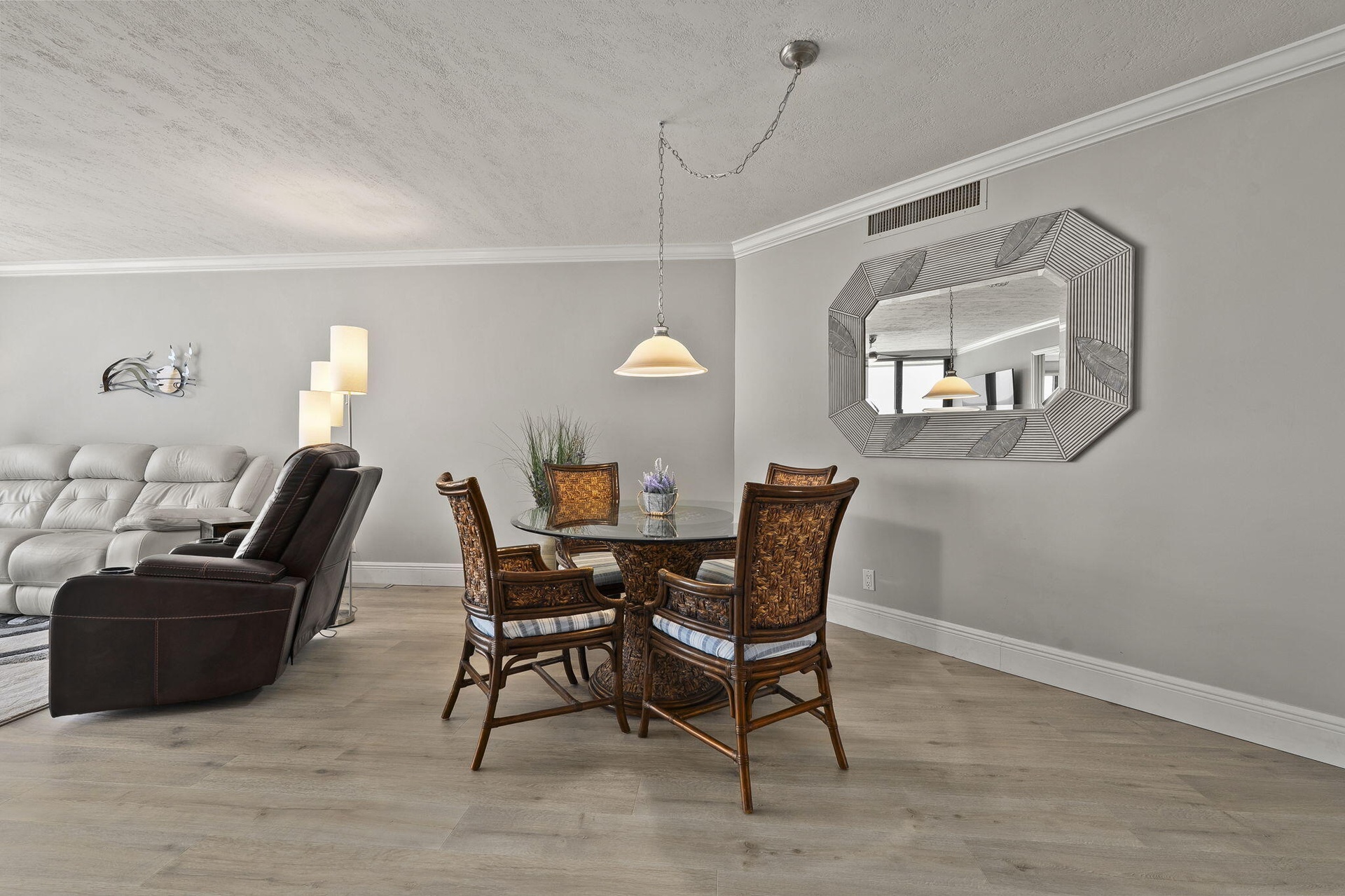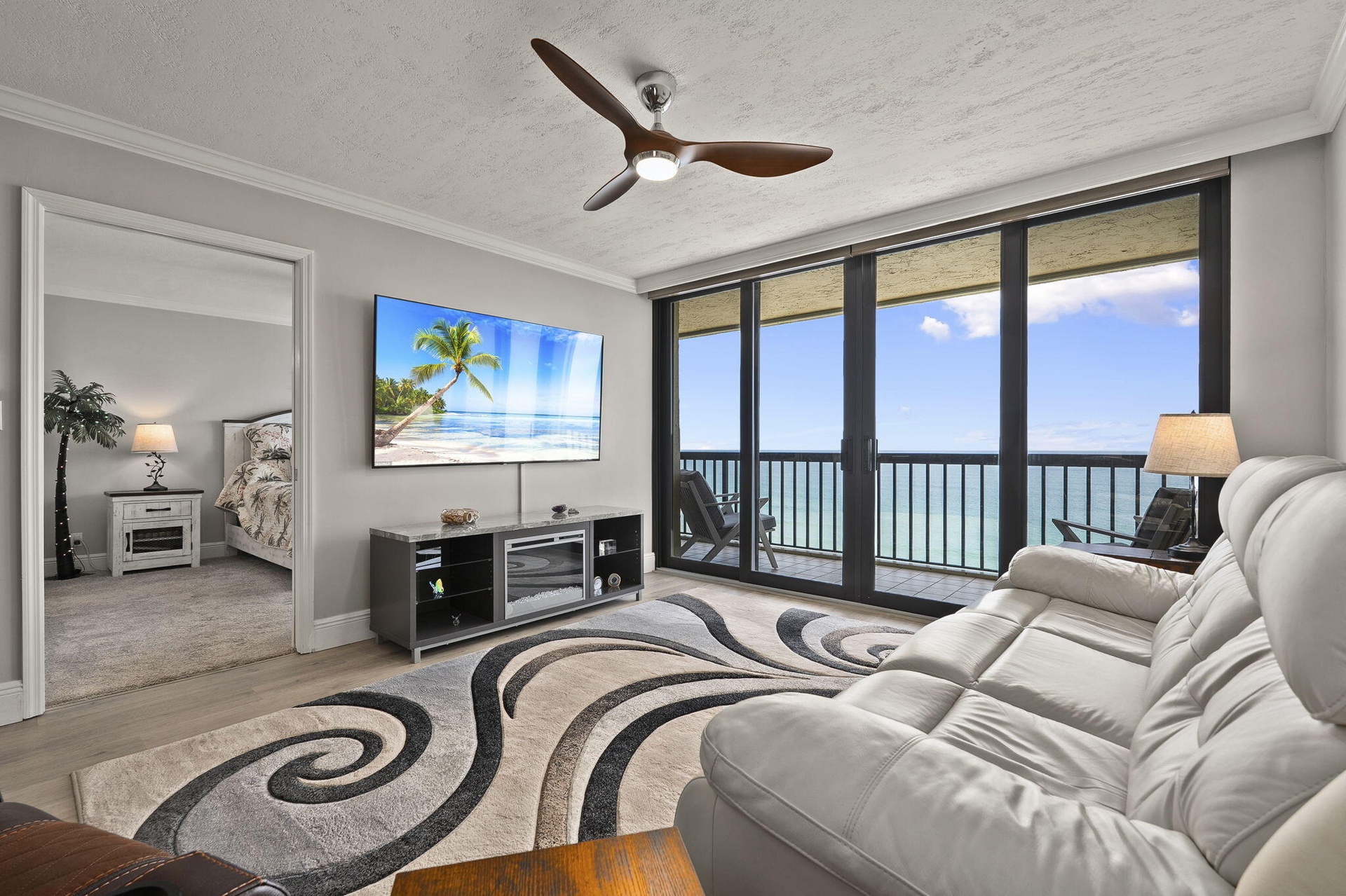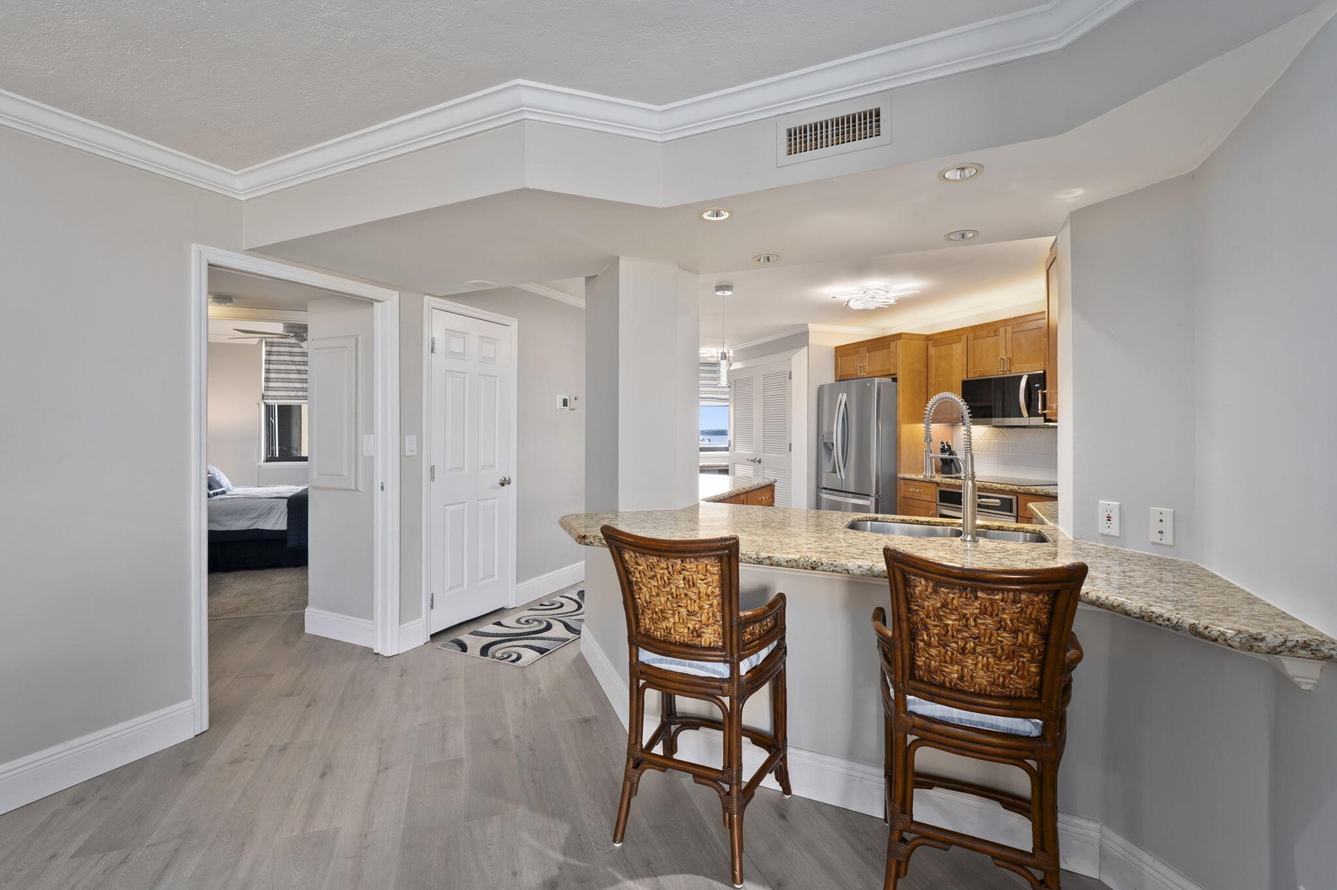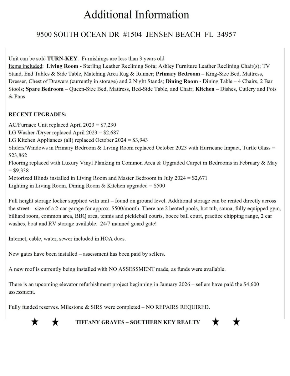 Priced below market value with $50k in recent upgrades & priced $20k below what sellers paid! This unit IS priced to sell! It is immaculate, truly move-in ready, and can be sold TURN-KEY (Fully furnished with linens, towels, dishes, cutlery, & pots/pans.) You can walk in & start living! Improvements within last 2 yrs include: Impact turtle glass sliders-primary bedroom/living room; NEW: AC/furnace; all LG stainless-steel kitchen appliances & full-size LG washer/dryer; upgraded flooring; remote-controlled motorized blinds & updated lighting. Solid wood cabinetry with roll-out drawers, granite countertops, full-size walk-in closet in primary bedroom, dual sinks in primary bath. Guest bedroom converts to en-suite with pull-out door for guest privacy.Spacious roomsizes/office area.