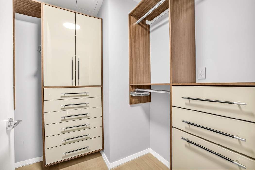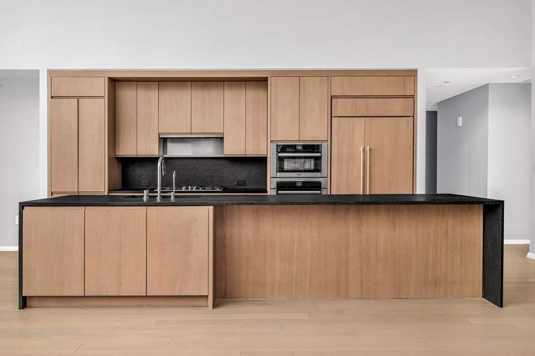 The airy living space features white oak floors, motorized shades, and a custom built-in library wall. The open chef’s kitchen is equipped with Miele & Sub-Zero appliances, a 13-foot island with storage, two pull-out pantries, a multi-freshwater filtration system, and a vented range hood.