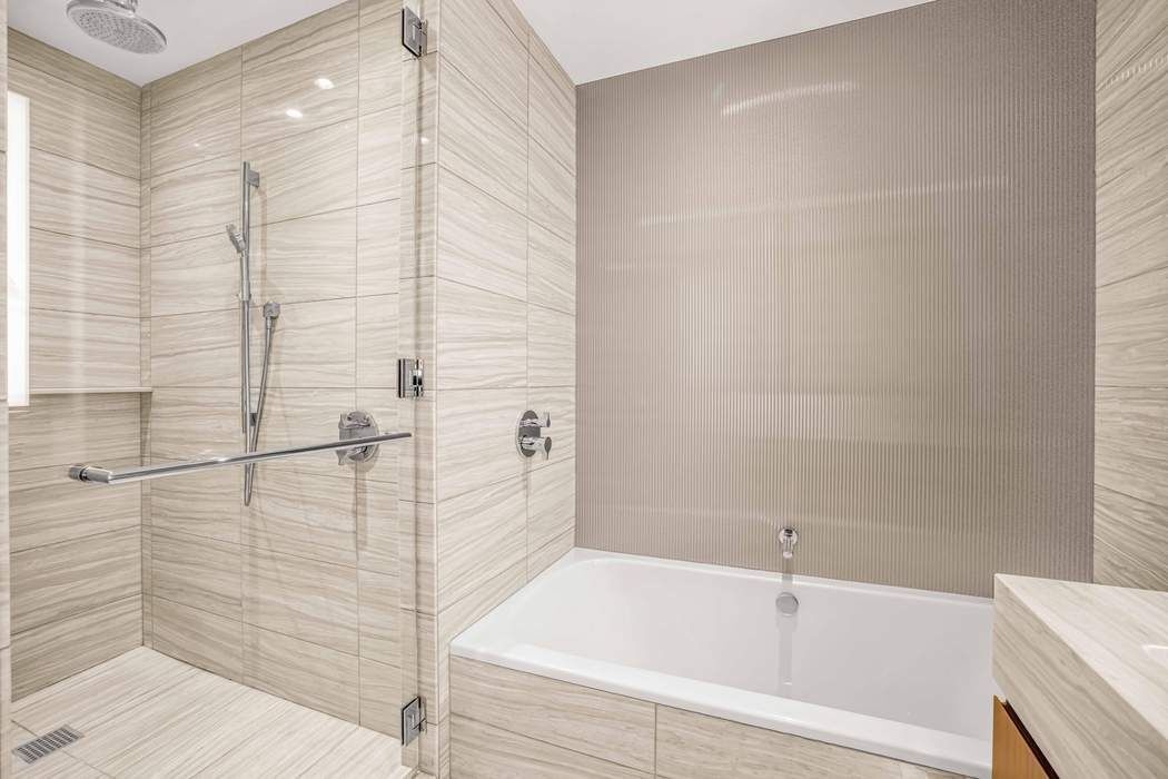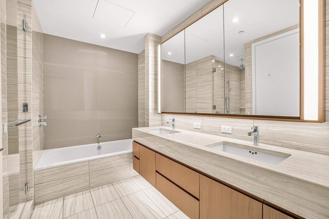 Soaring nearly 20 feet high, the double-height living room of this southeast-facing 3-bedroom, 3.5-bathroom duplex frames sweeping views of New York Harbor and nearby parks through curved floor-to-ceiling windows. Spanning 2,309 SF, Residence 18B pairs bold architecture with custom, high-end finishes.