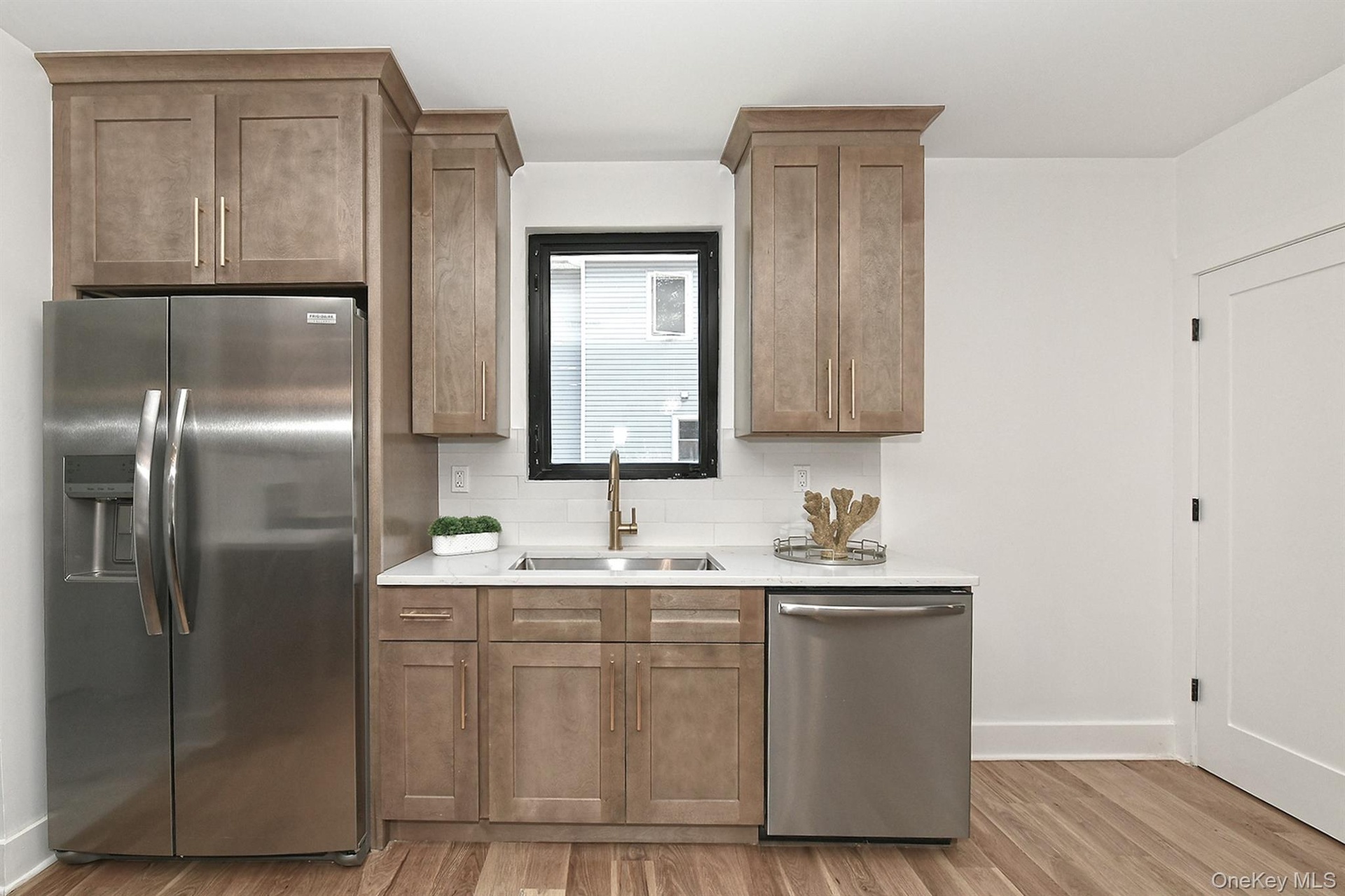 - Kitchen featuring appliances with stainless steel finishes, light wood-type flooring, light countertops, and decorative backsplash