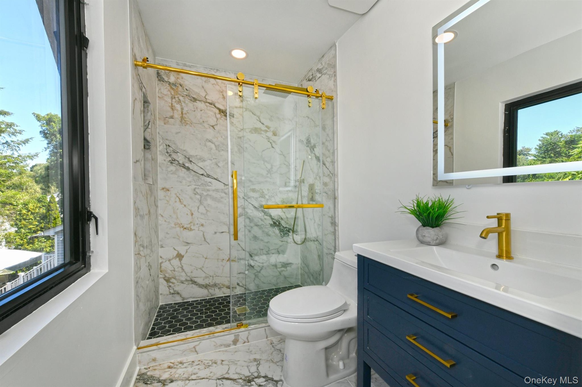 - Full bath featuring vanity, a marble finish shower, and recessed lighting