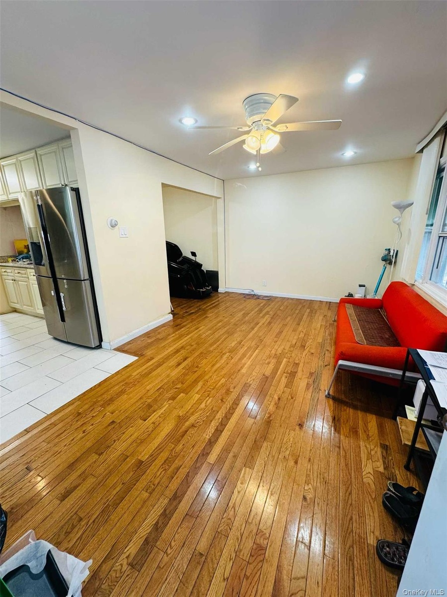 - Living area featuring light wood finished floors, a ceiling fan, and recessed lighting