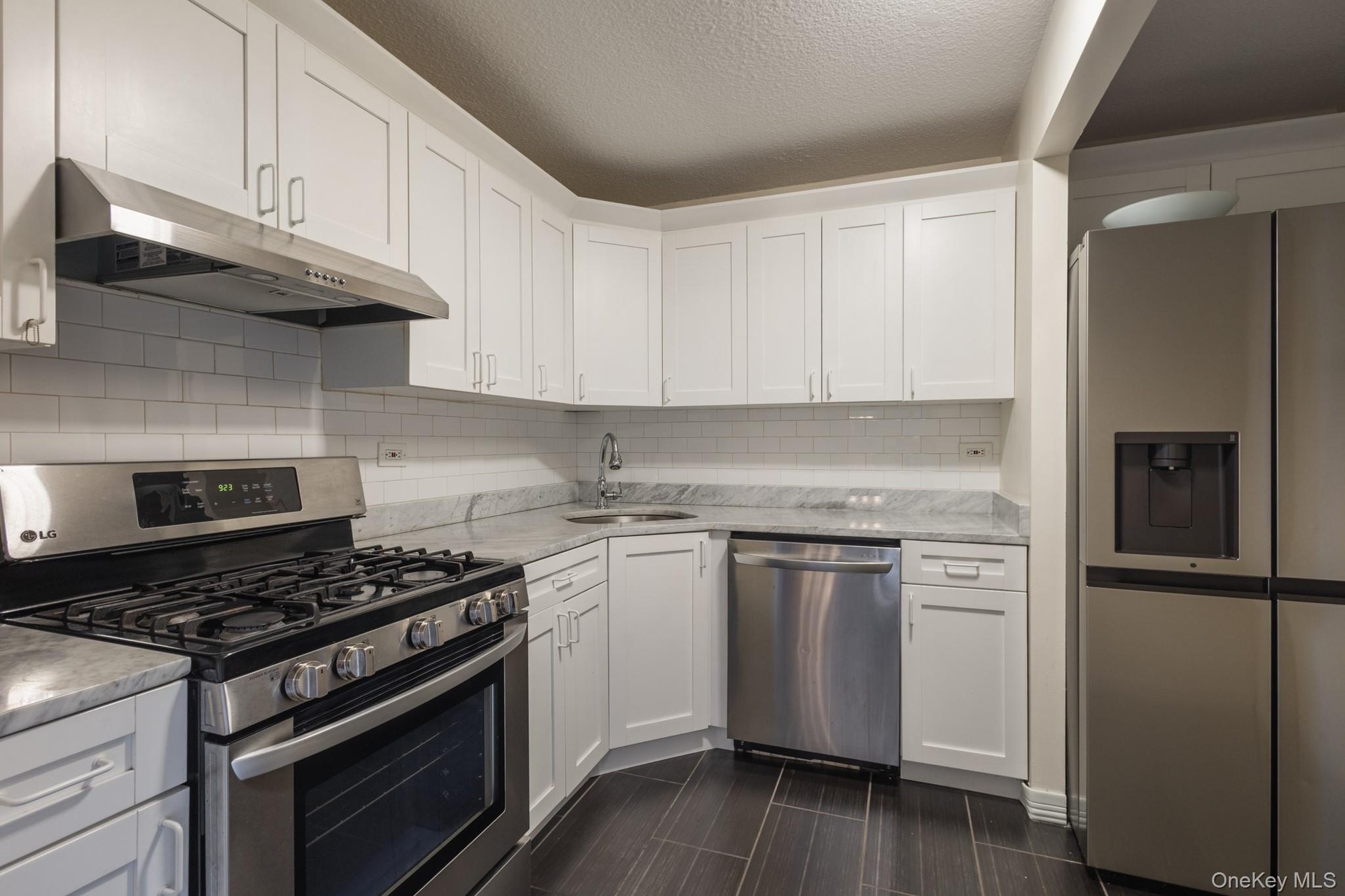 - Kitchen with stainless steel appliances, white cabinetry, under cabinet range hood, backsplash, and light stone countertops