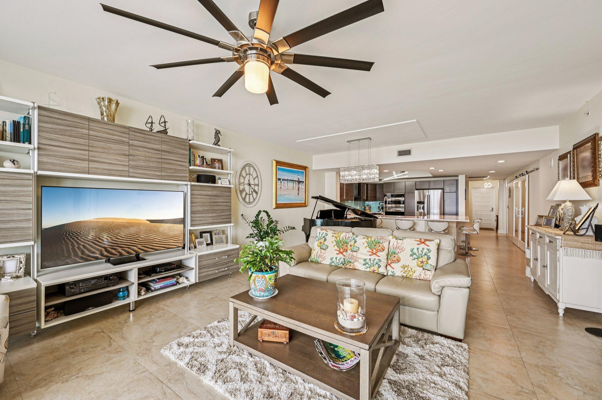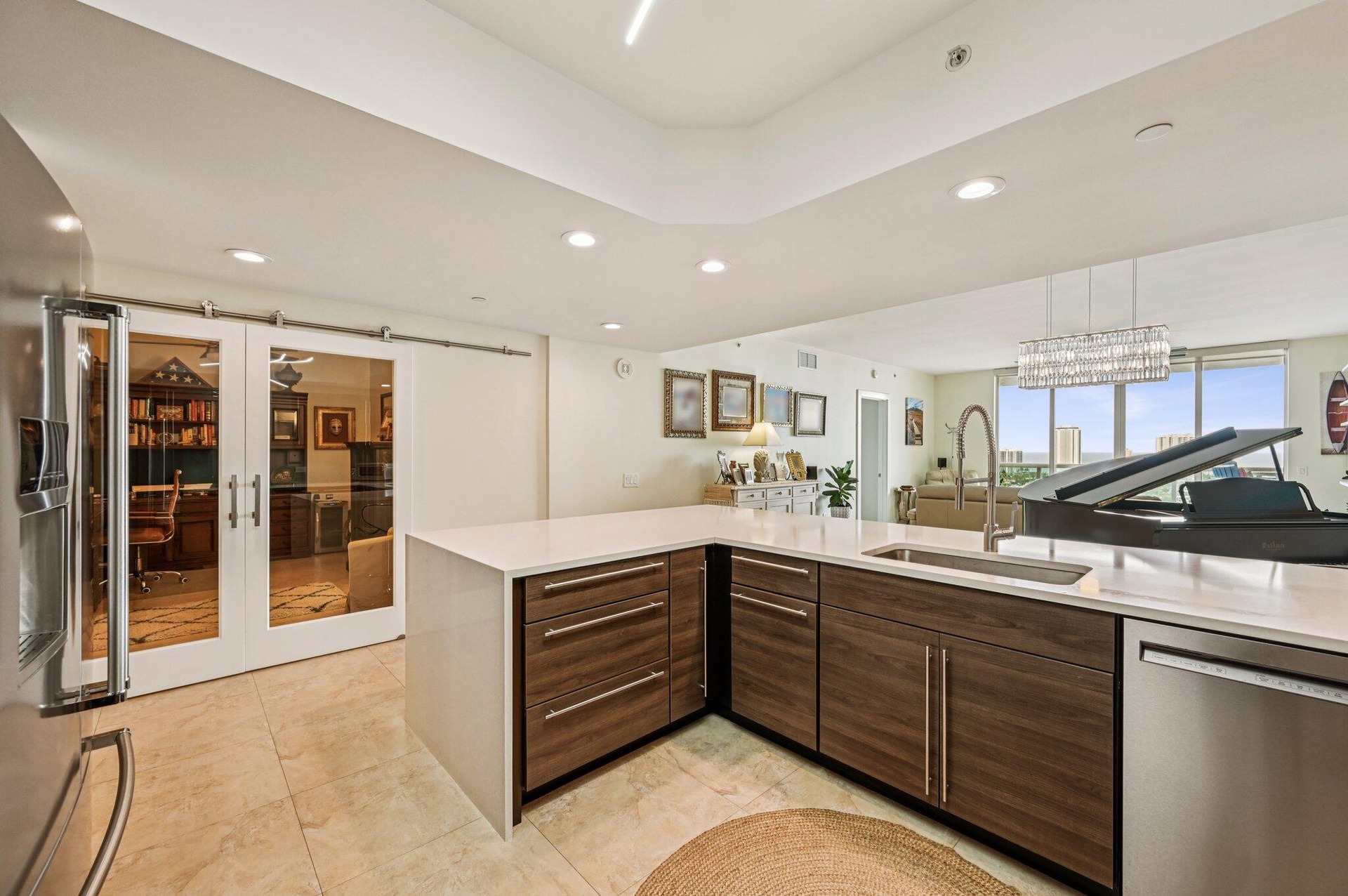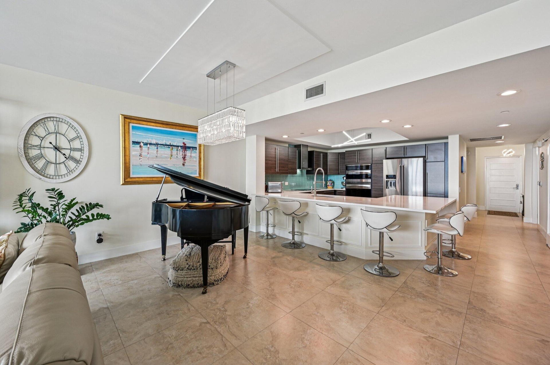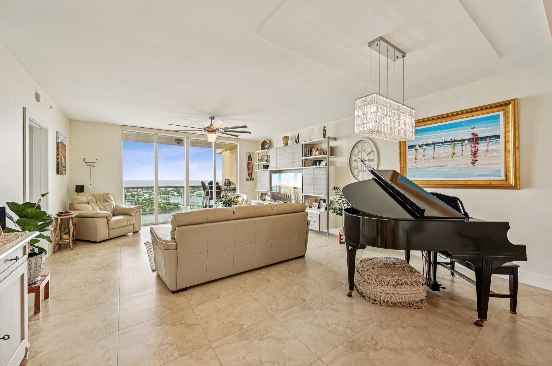 DescriptionGorgeous direct, unobstructed views of the Intracoastal Waterway and Atlantic Ocean from this preferred Ocean Tower, 23rd-floor residence at Marina Grande. Enjoy breathtaking sunrises and refreshing ocean breezes from your spacious balcony, living room, and owner's suite. Desirable split floor plan features 2 bedrooms plus a large den--ideal for a home office or 3rd bedroom. The chef's dream kitchen boasts seating for six at the countertop bar, new custom cabinetry, white quartz countertops, a turquoise glass backsplash, and premium Kenmore & KitchenAid stainless steel appliances, including induction cooktop, warming drawer, and convection oven. The owner's suite is a relaxing retreat with dual white custom vanities, a walk-in shower with frameless glass doors, a separate water closet, and