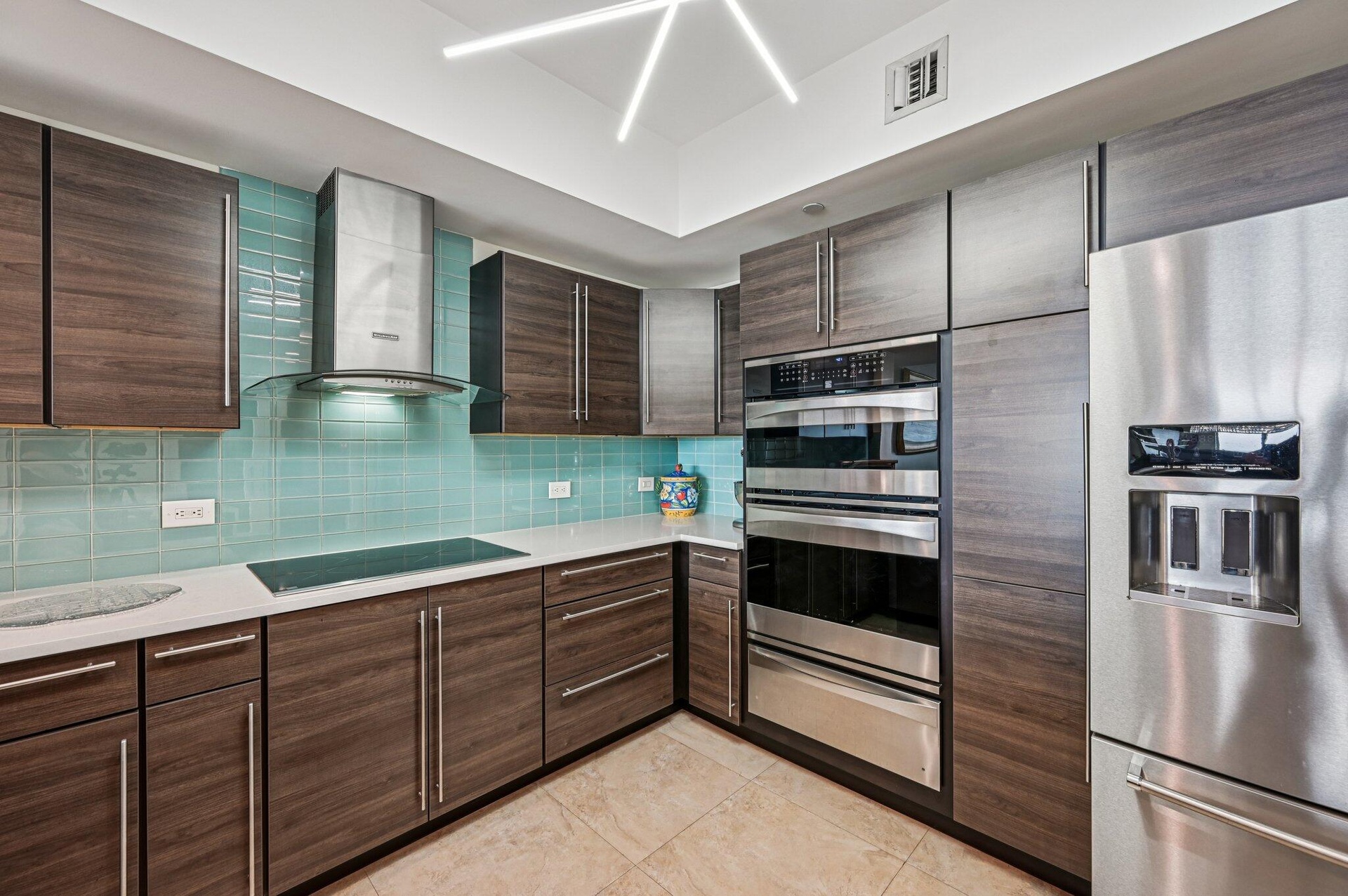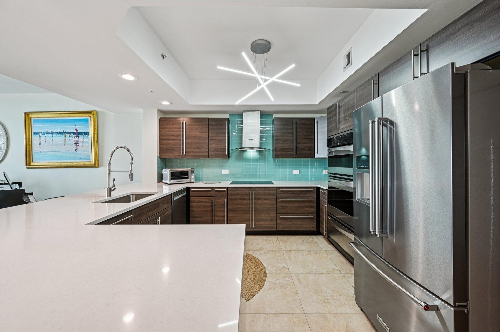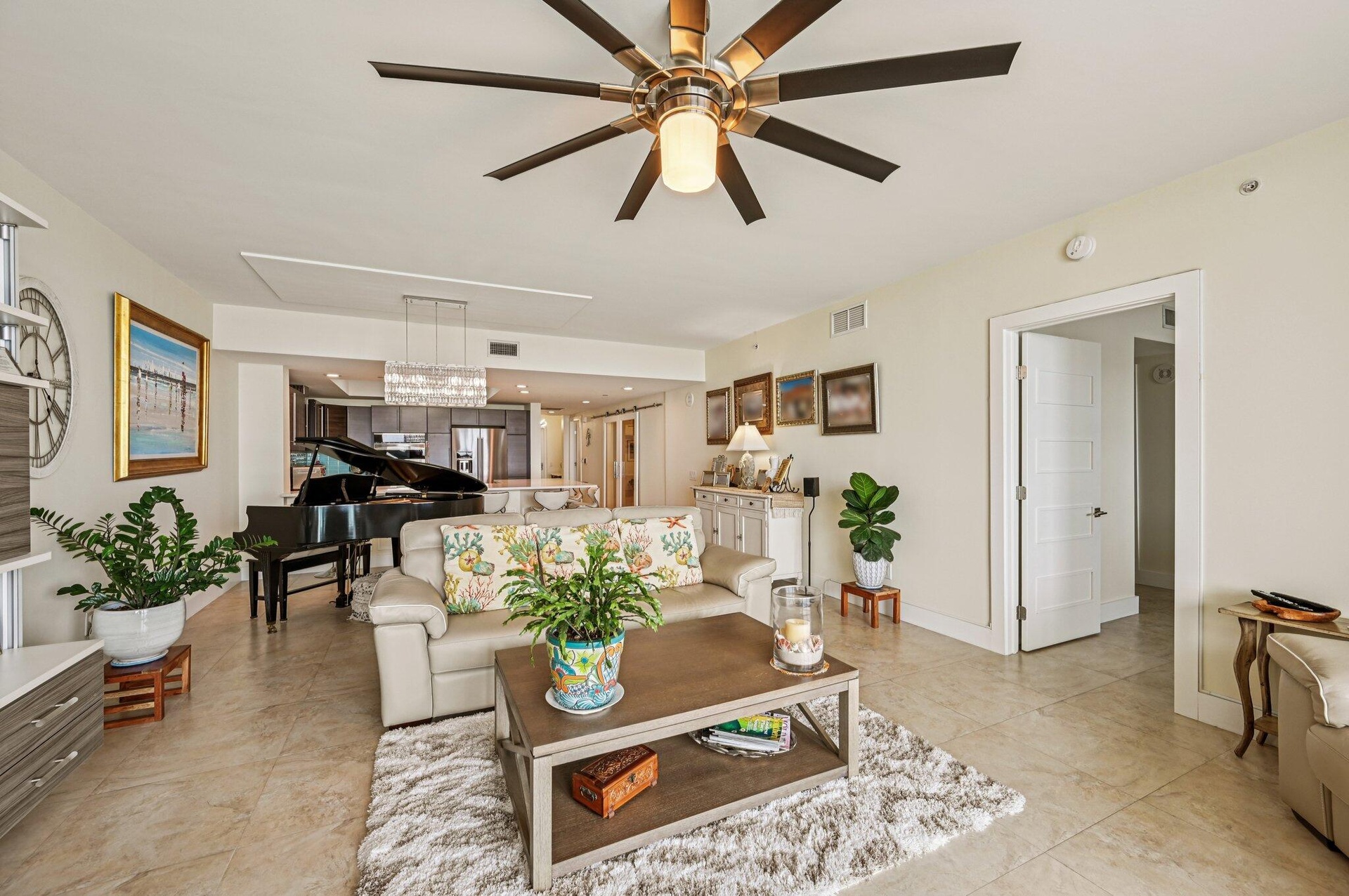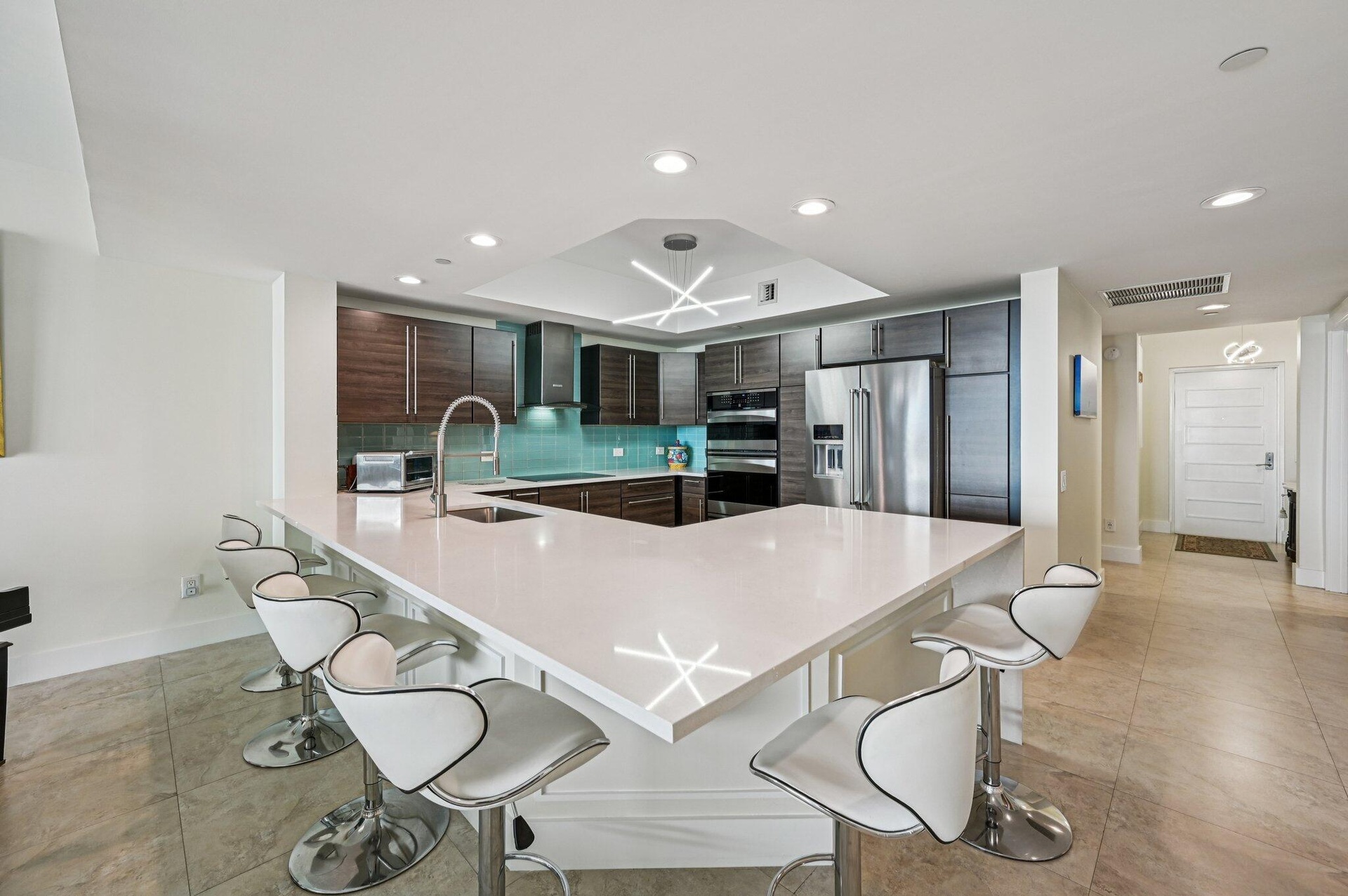 DescriptionGorgeous direct, unobstructed views of the Intracoastal Waterway and Atlantic Ocean from this preferred Ocean Tower, 23rd-floor residence at Marina Grande. Enjoy breathtaking sunrises and refreshing ocean breezes from your spacious balcony, living room, and owner's suite. Desirable split floor plan features 2 bedrooms plus a large den--ideal for a home office or 3rd bedroom. The chef's dream kitchen boasts seating for six at the countertop bar, new custom cabinetry, white quartz countertops, a turquoise glass backsplash, and premium Kenmore & KitchenAid stainless steel appliances, including induction cooktop, warming drawer, and convection oven. The owner's suite is a relaxing retreat with dual white custom vanities, a walk-in shower with frameless glass doors, a separate water closet, and
