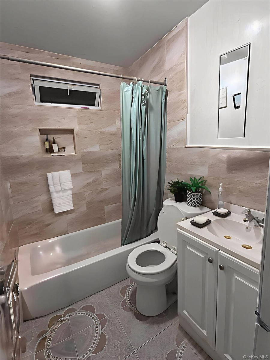 - Full bath with shower / bath combo, vanity, and light tile patterned floors