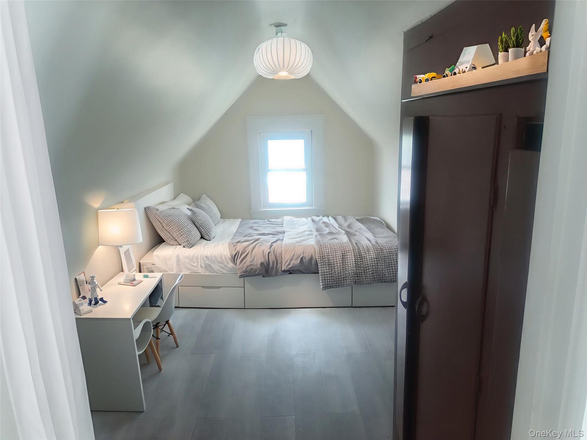 - Bedroom with finished floors and Vaulted Gable-Style ceiling facing south.