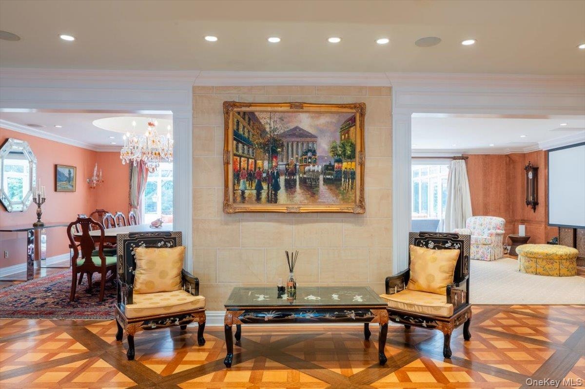 - Living area featuring recessed lighting, ornamental molding, and a chandelier